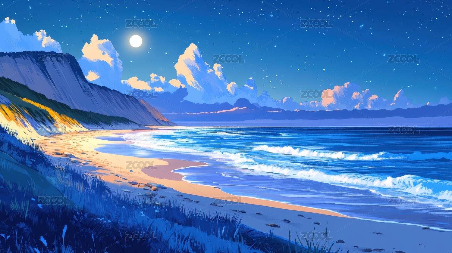 海边,大海,海浪,沙滩,浪花,夜晚,星空,日出,山脉,霞光
