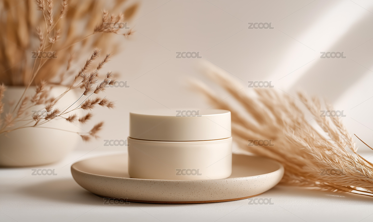 浅米色护肤罐配干花简约静物场景