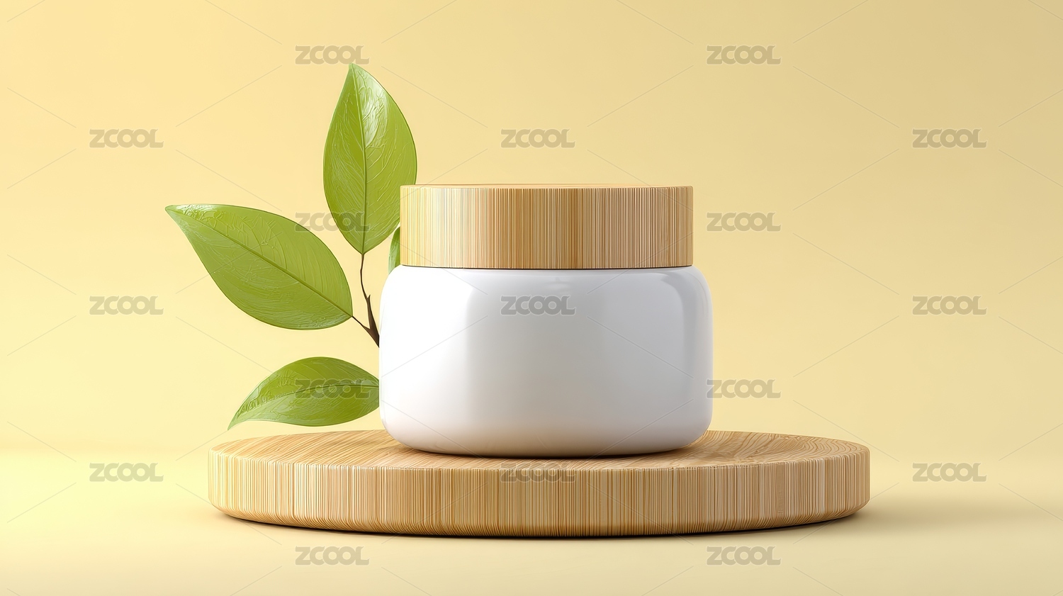 带绿叶的天然白色化妆品罐