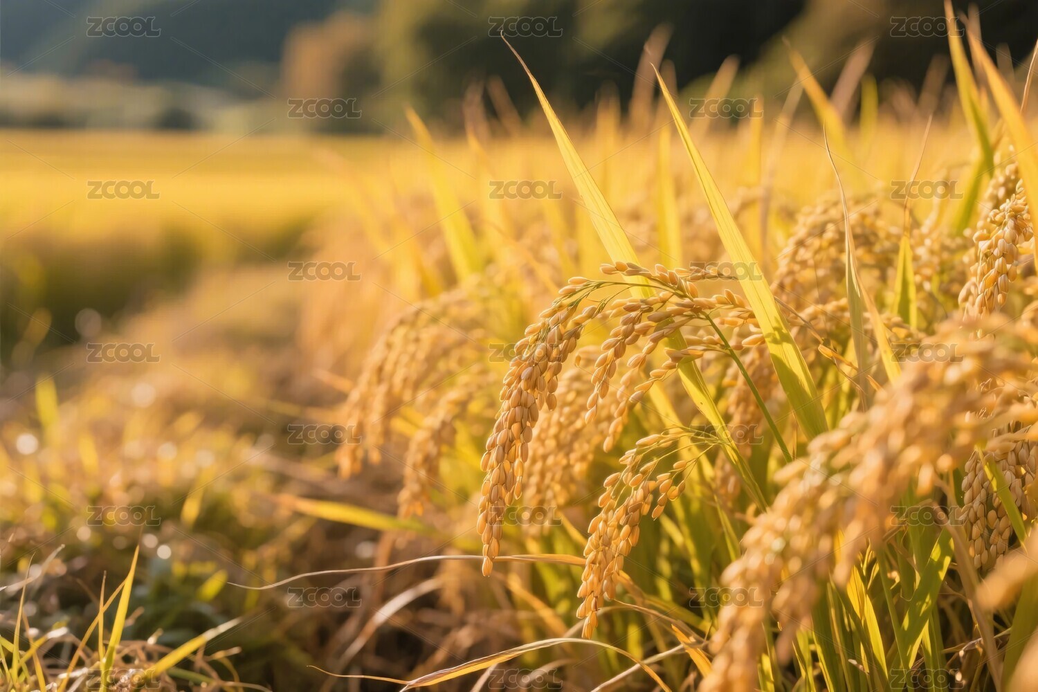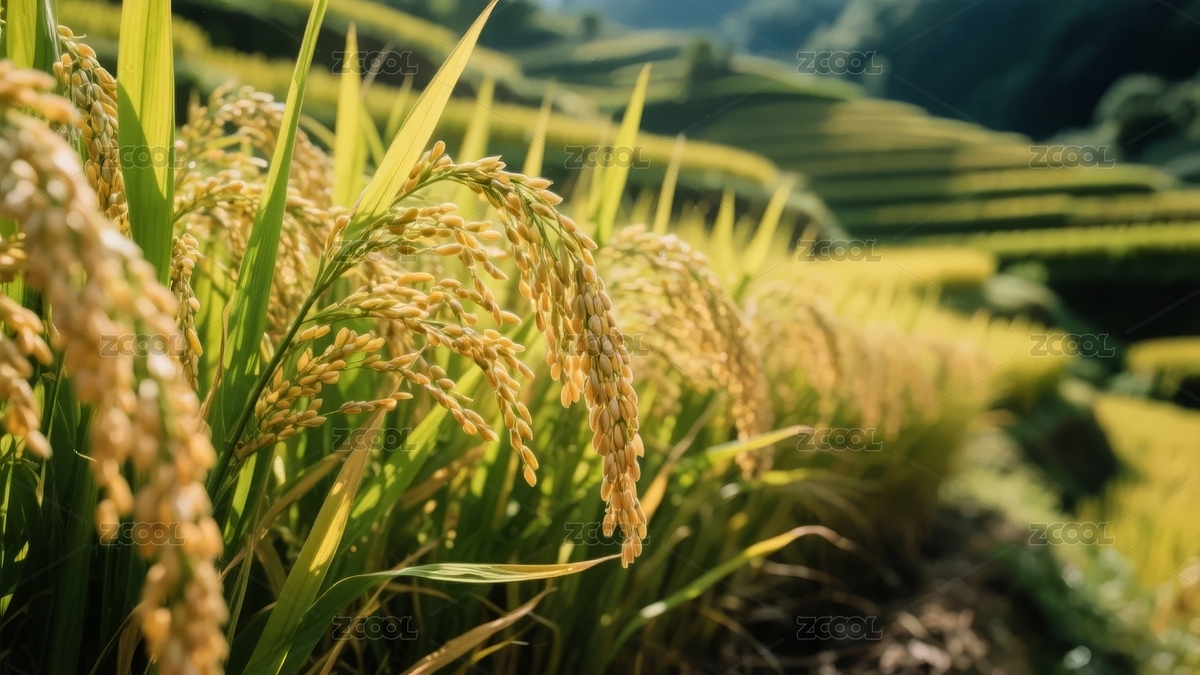 金黄的稻田中几穗沉甸甸的成熟稻穗特写