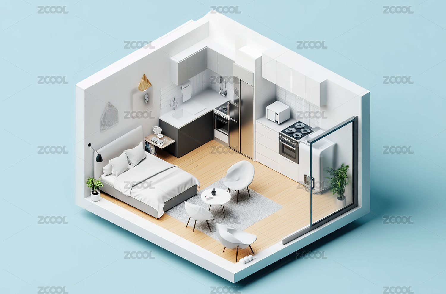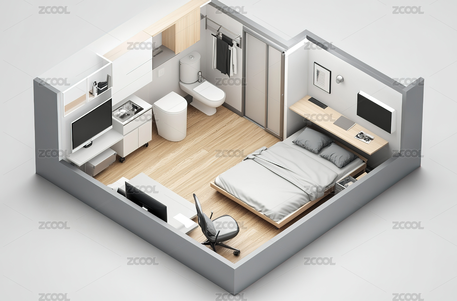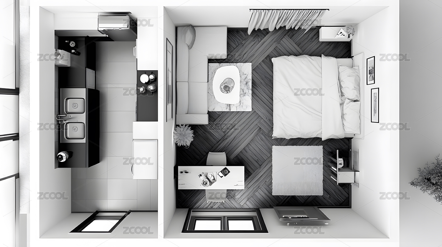 现代简约公寓室内布局鸟瞰图
