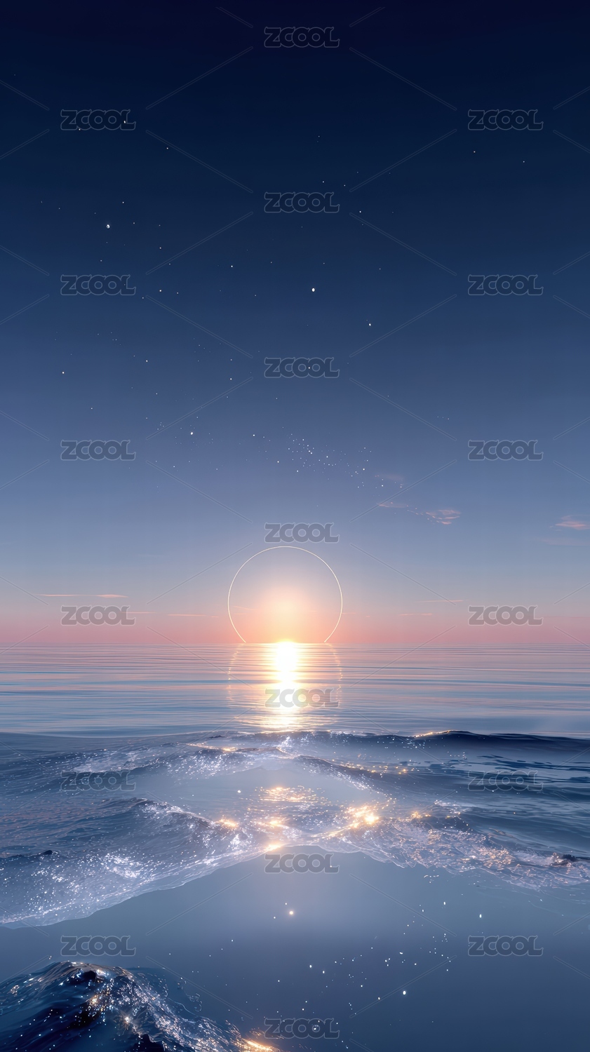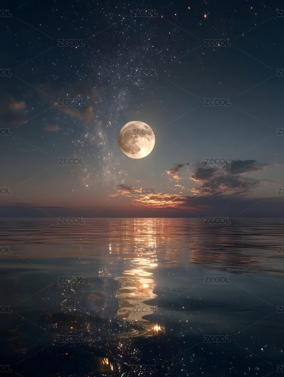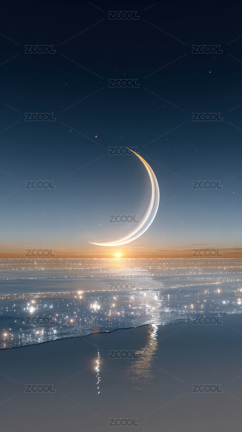 夜空,月亮,星星,沙滩,海面,倒影,城市,光晕