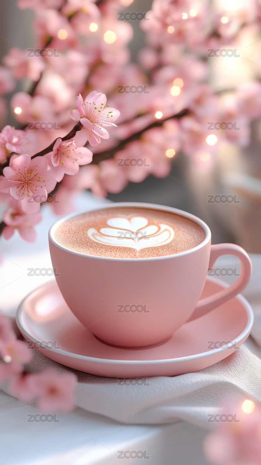 粉色,咖啡,杯子,花朵,桌子,花瓣,花枝,奶泡,桌面,花朵枝