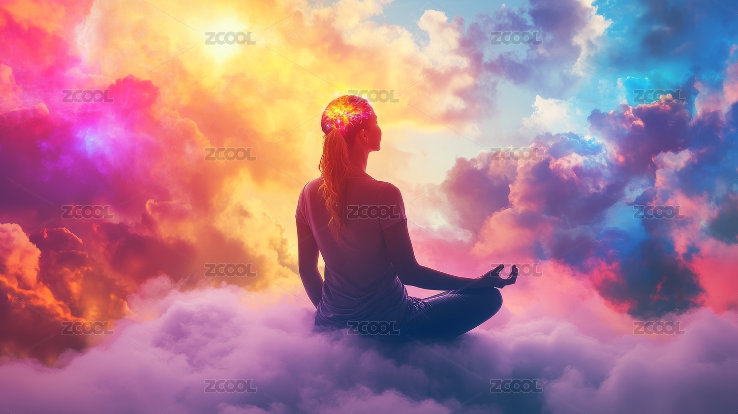 山顶上冥想的男子周围环绕着美丽的云层