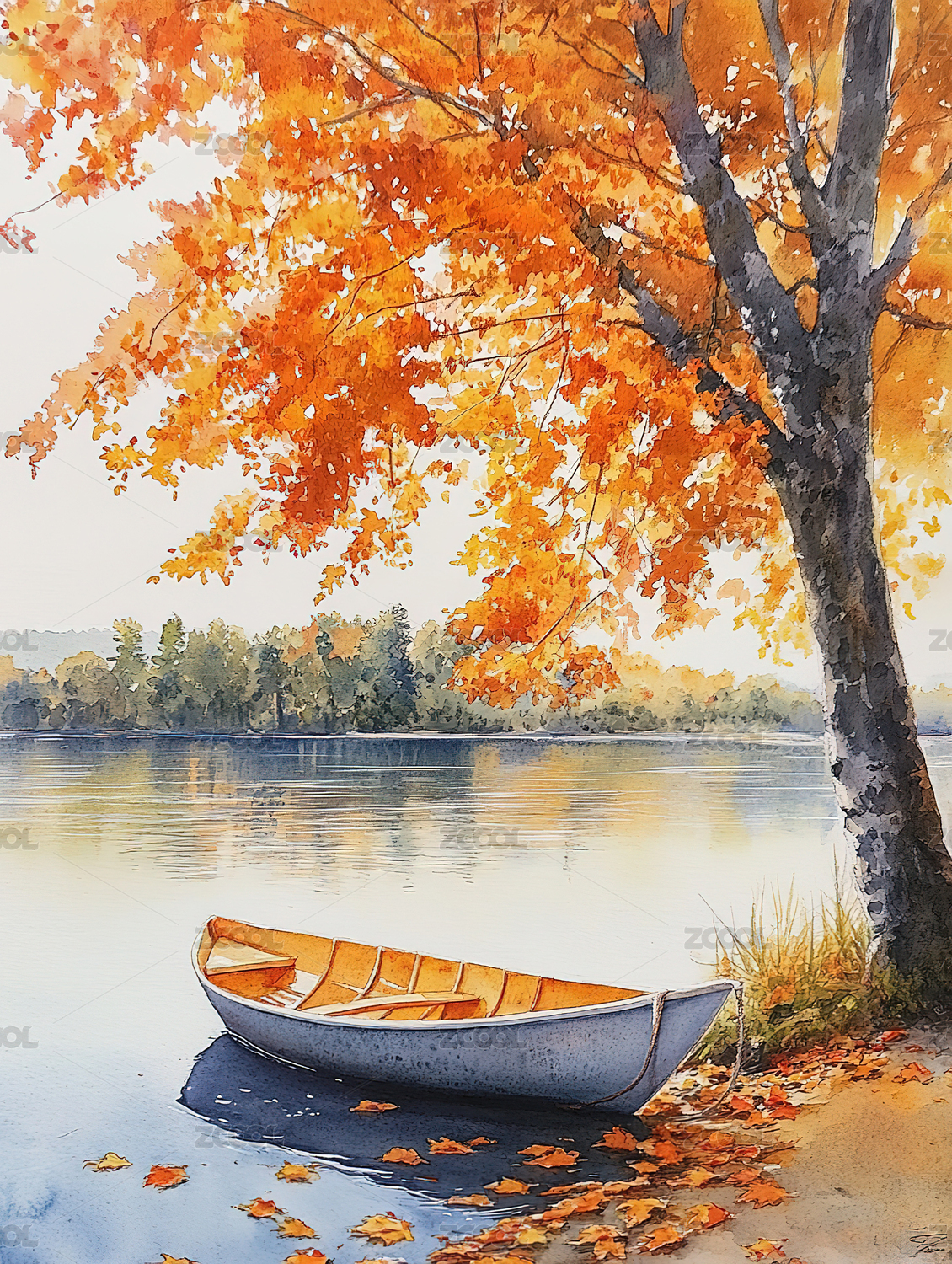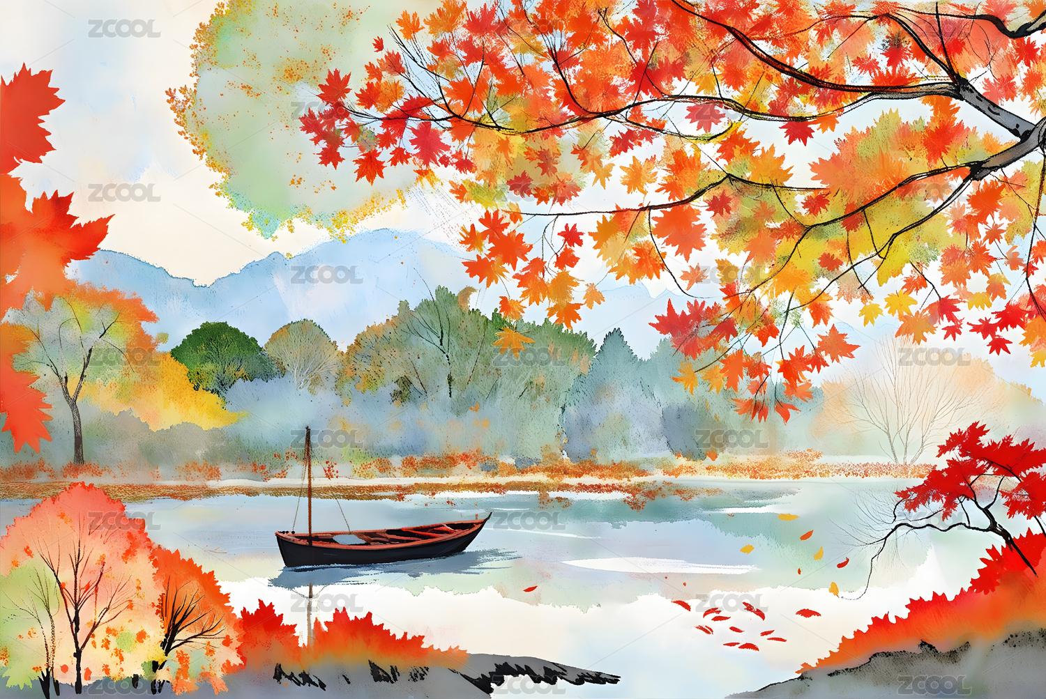 水彩韵湖景红枫小船远影