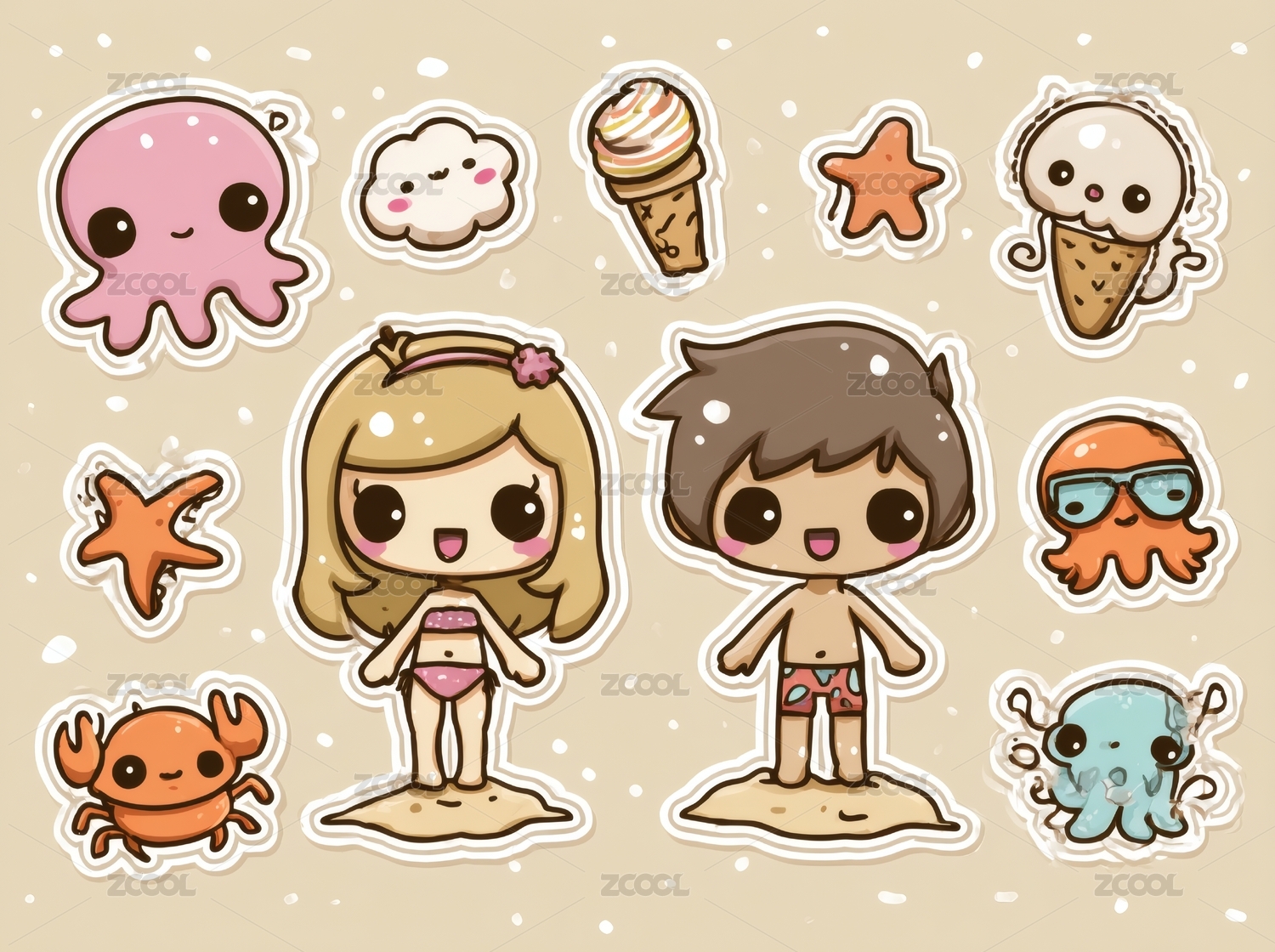 夏日沙滩可爱卡通人物贴纸