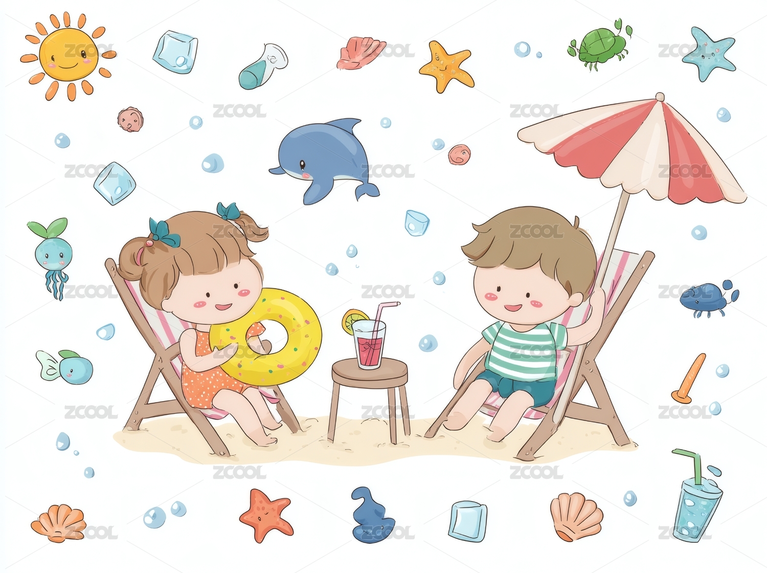 卡通人物与夏日元素插画