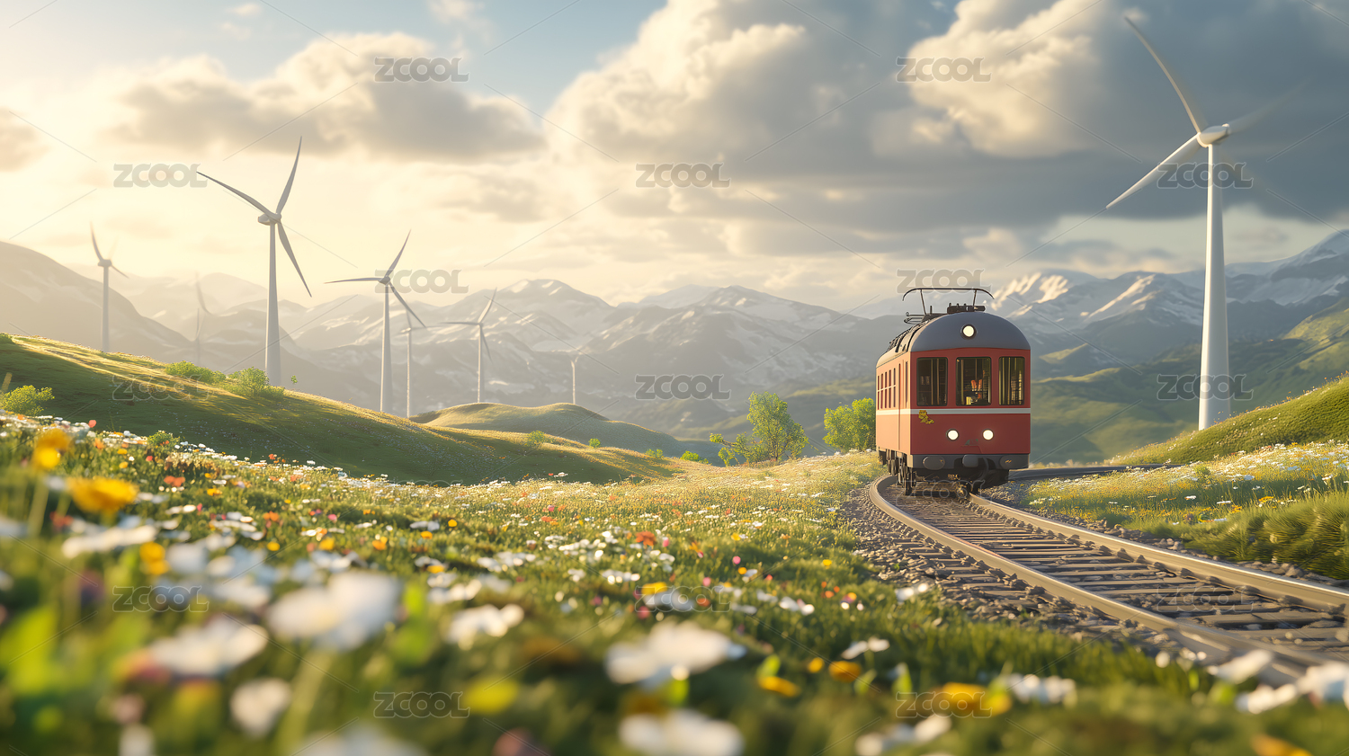 一辆粉色的复古列车从湖水和黄色的花田穿过