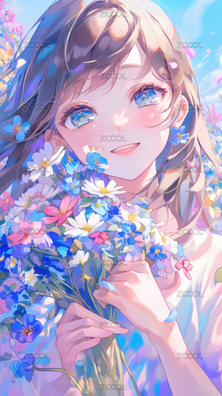 少女手捧花束背景满是鲜花