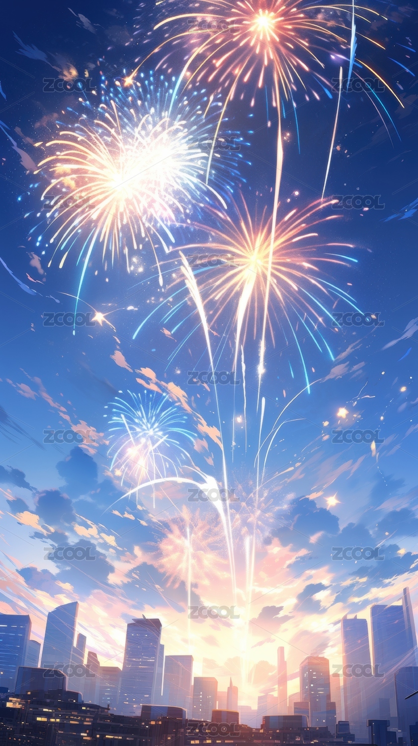 城市风光与烟花
