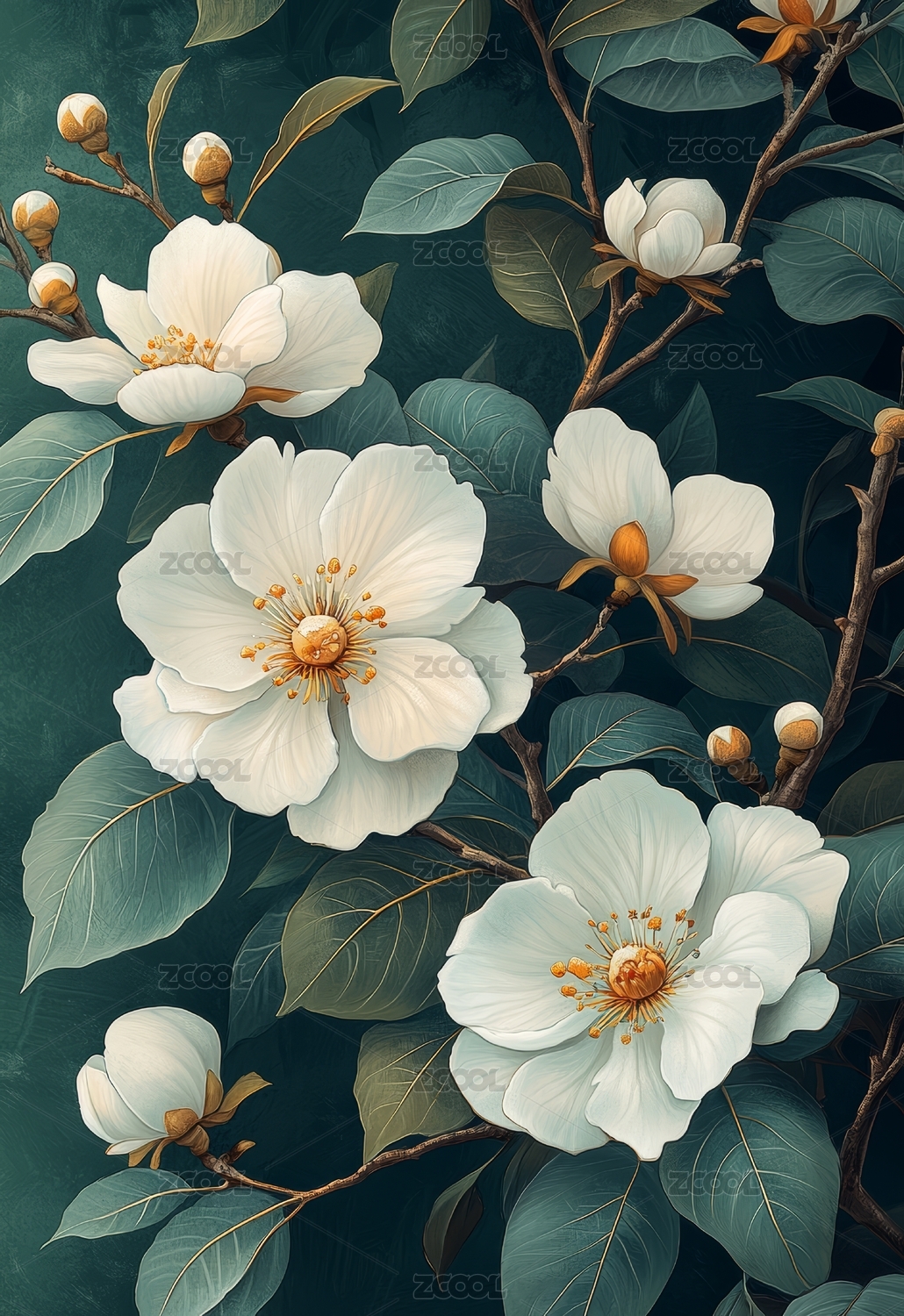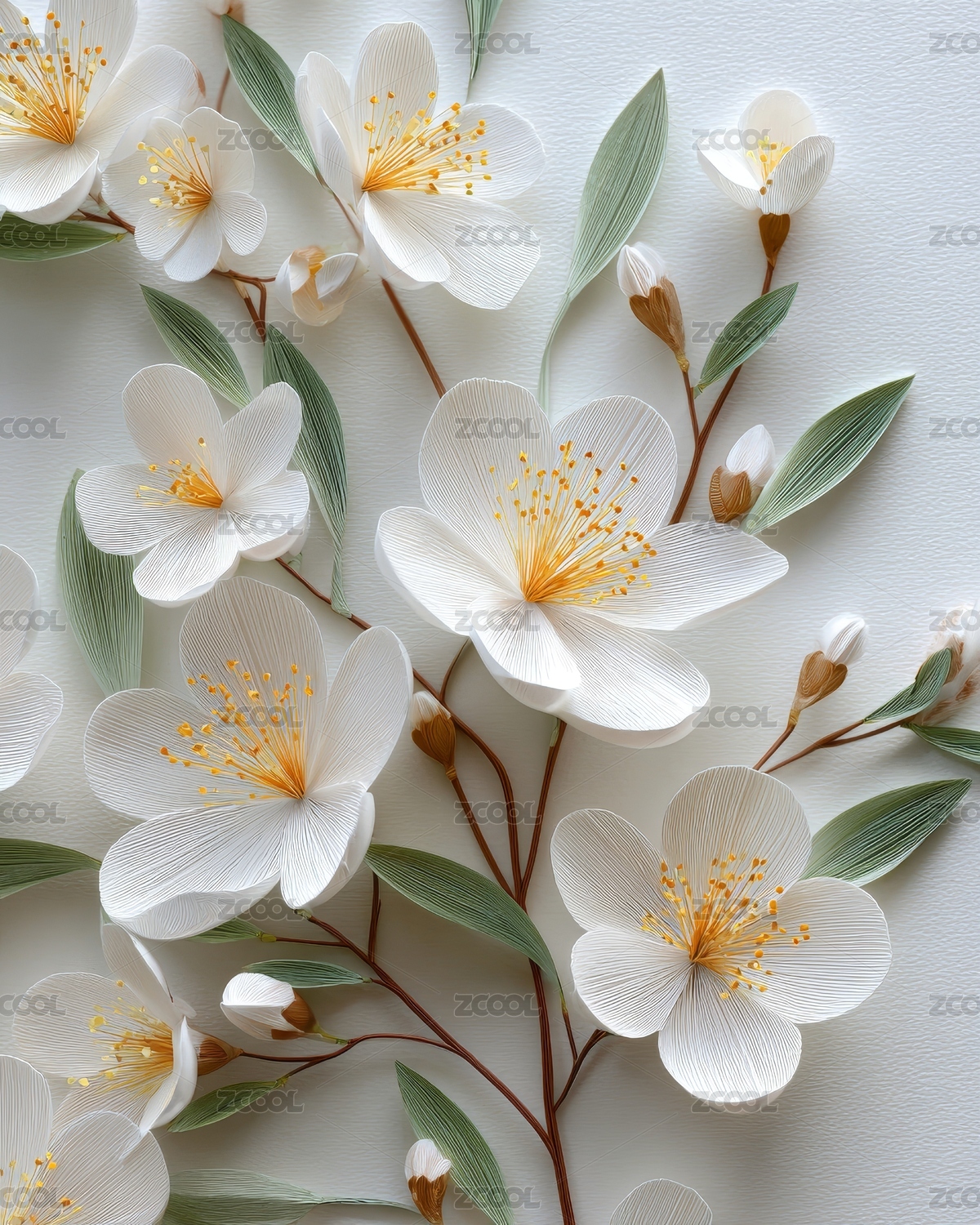 白花绿叶花卉图案