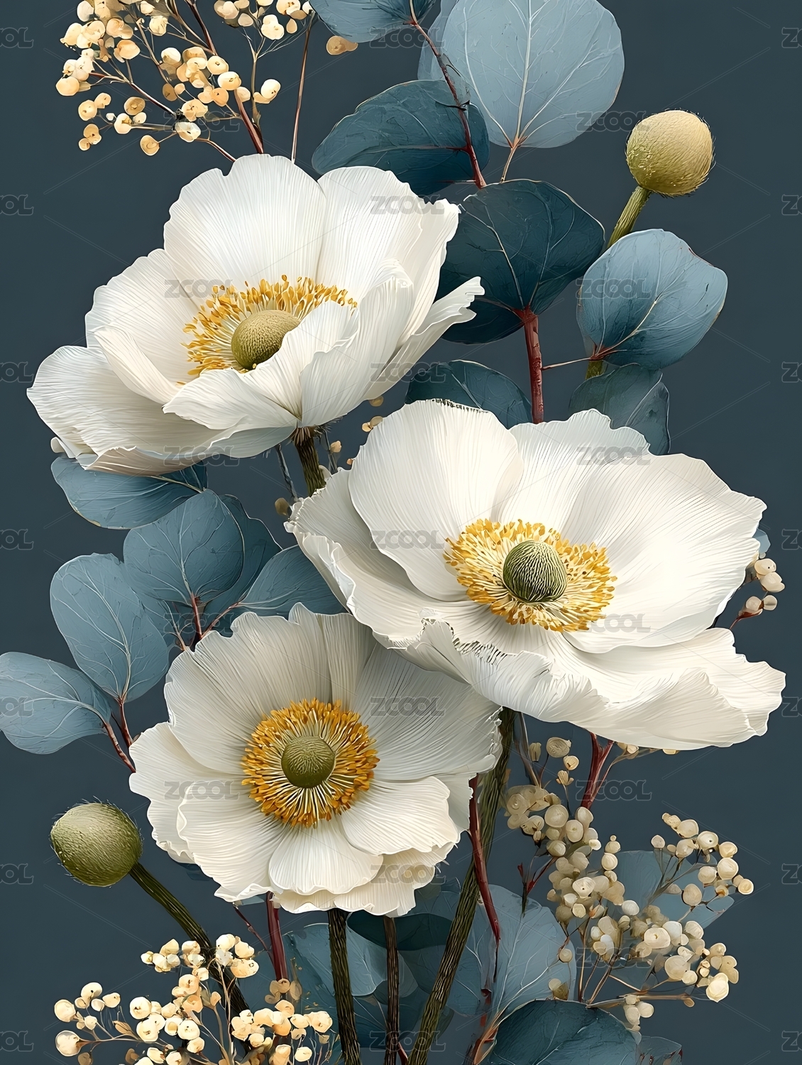 白色银莲花与绿叶花卉插画