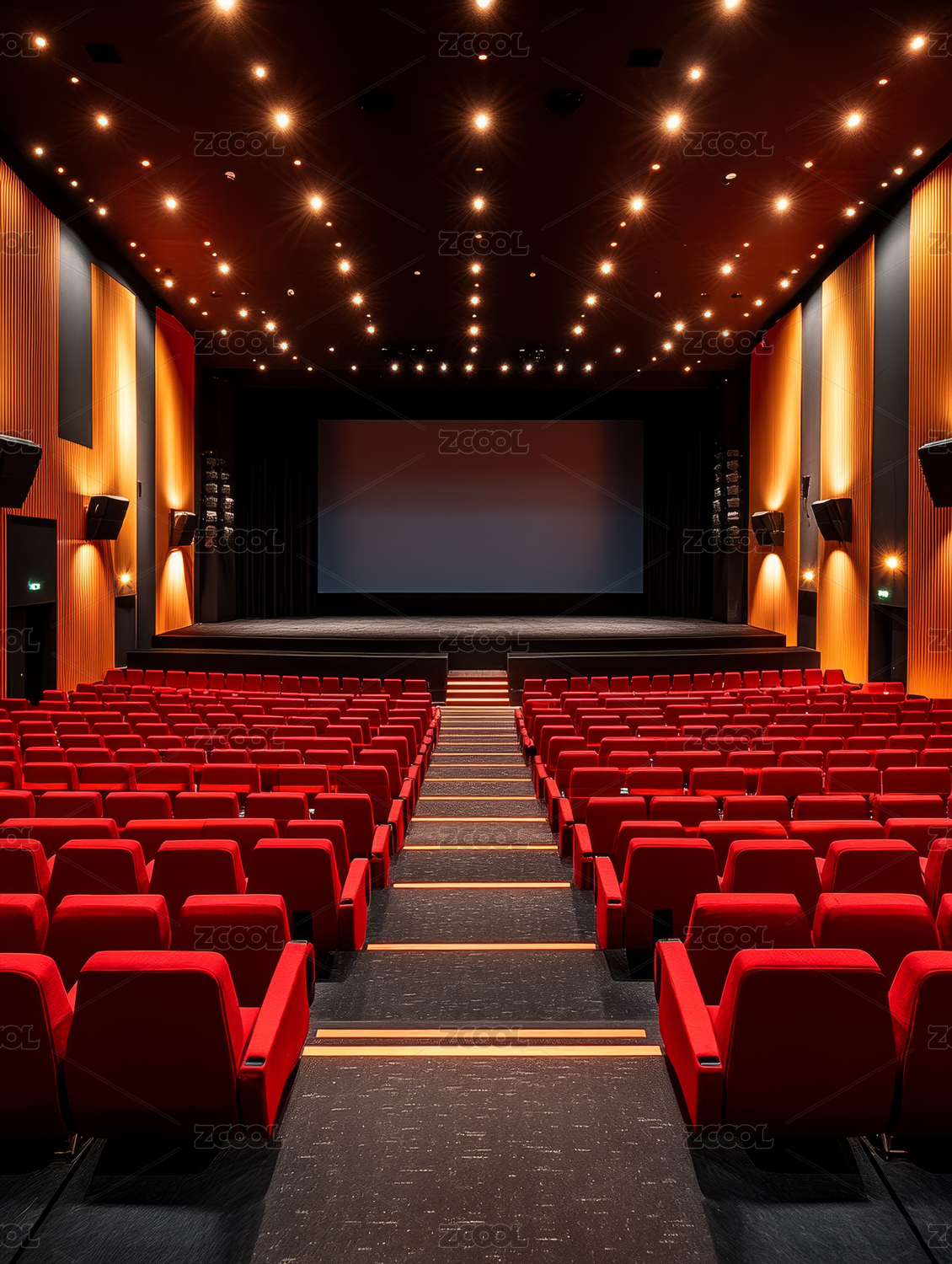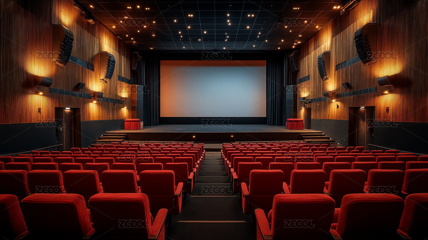 红色主题的剧场空间,舞台上有一块空白荧幕