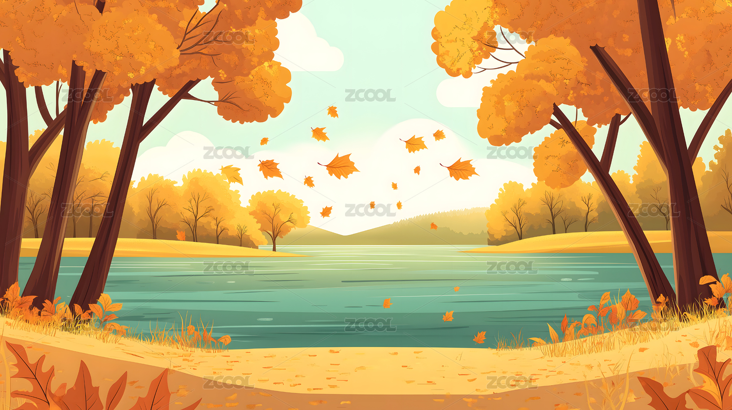 秋天风景扁平插画唯美治愈海报壁纸