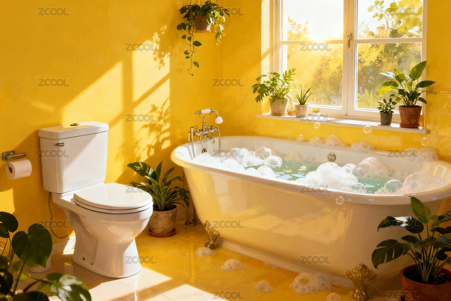 浴室,浴缸,马桶,毛巾,瓷砖,窗户,卡通,金色,水龙头,卫生间