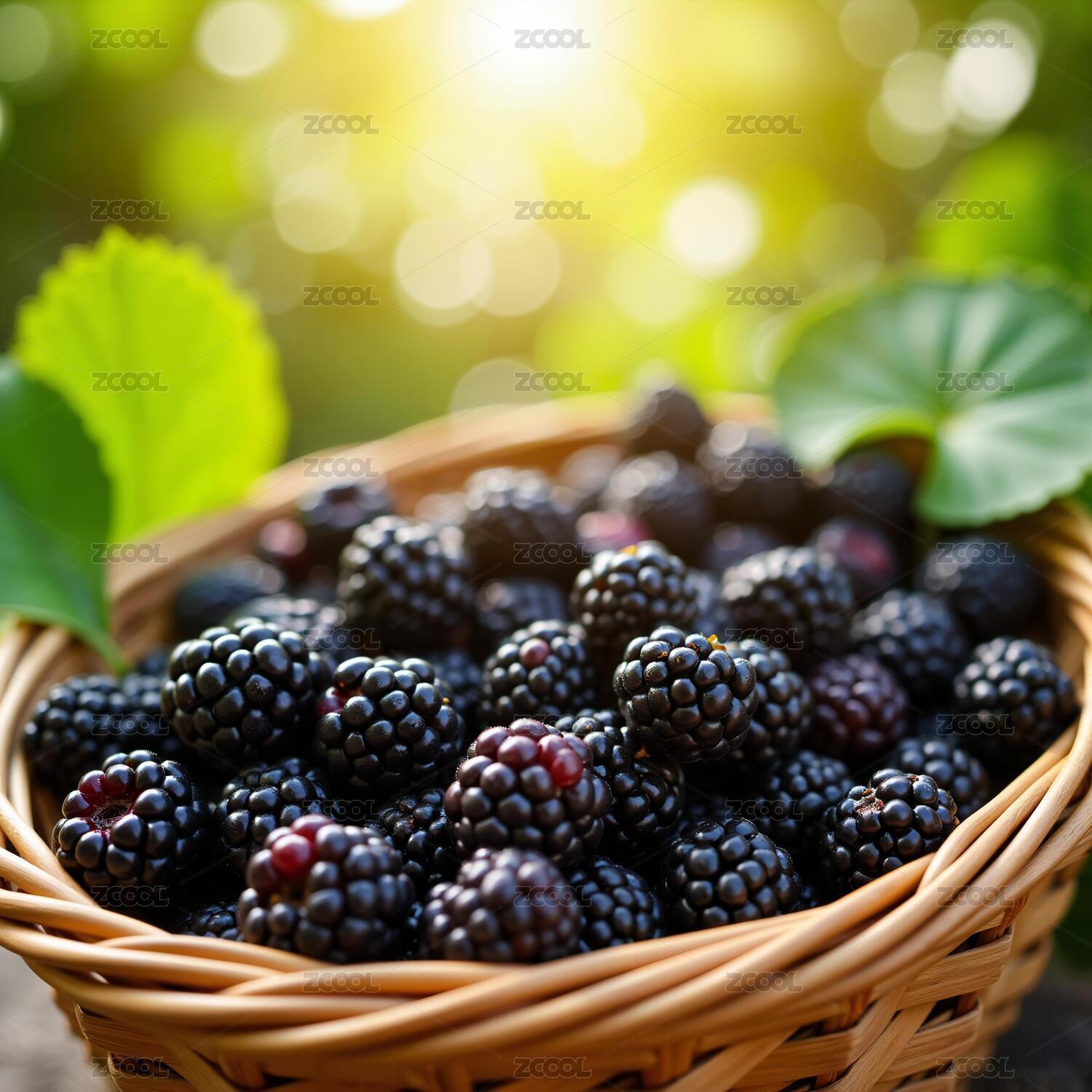 模糊果园绿色背景和新鲜采摘的黑色桑果特写