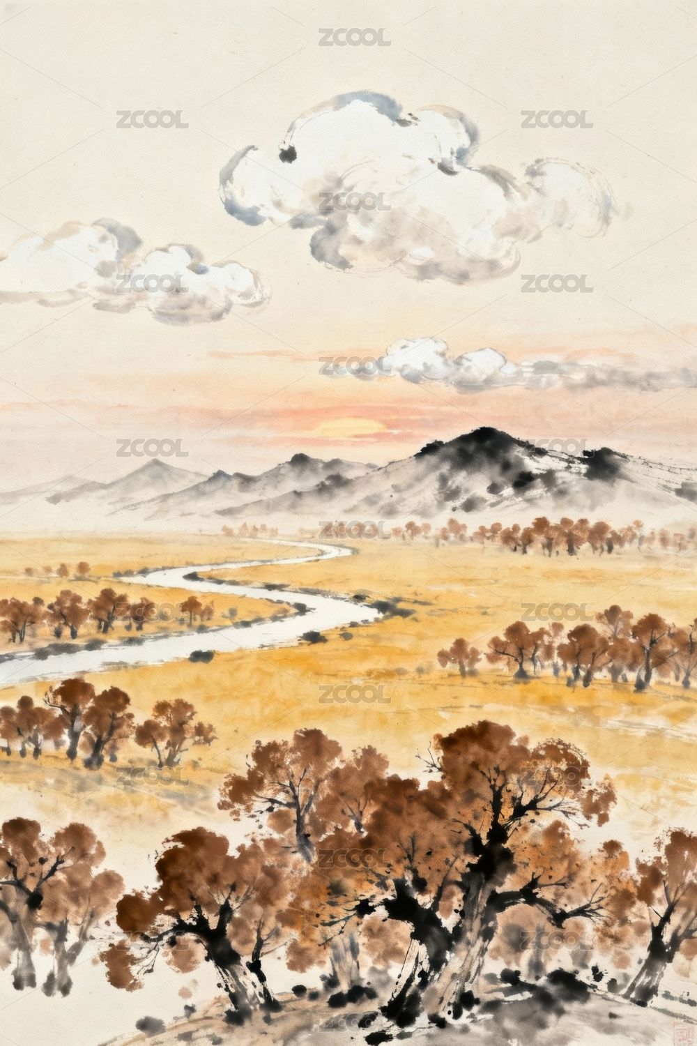 山水秋景暖色装饰背景