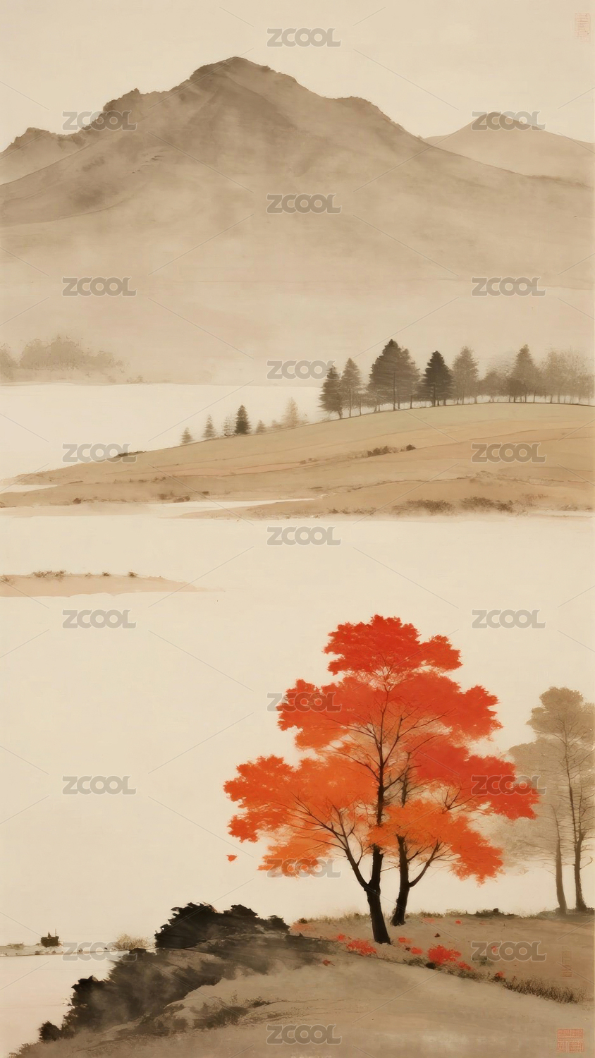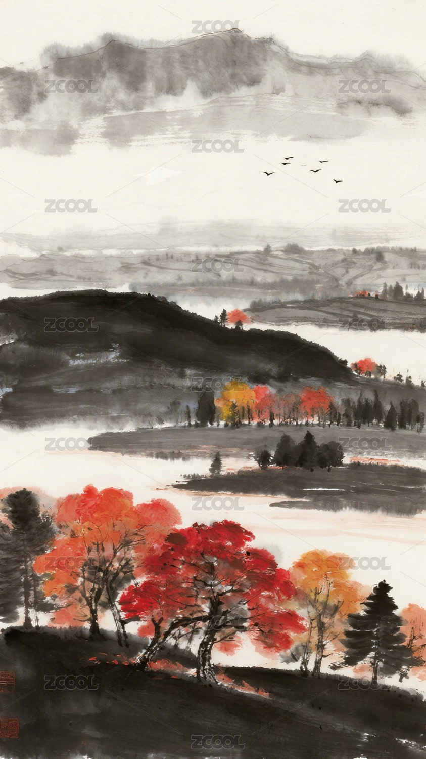 秋山红叶意境水墨画
