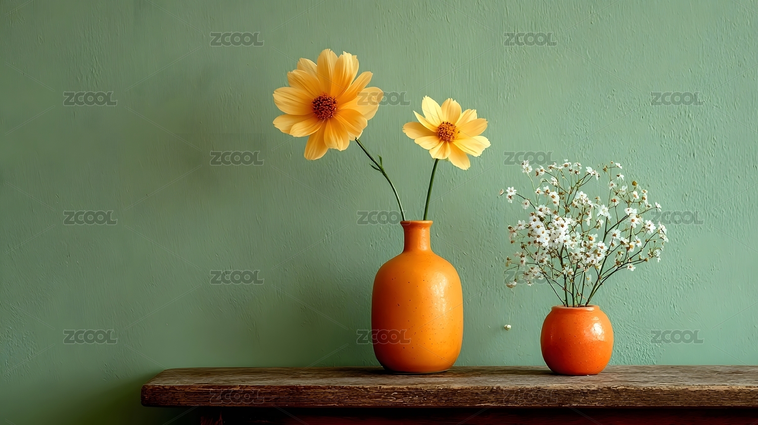 黄色花朵与橙色花瓶的静物