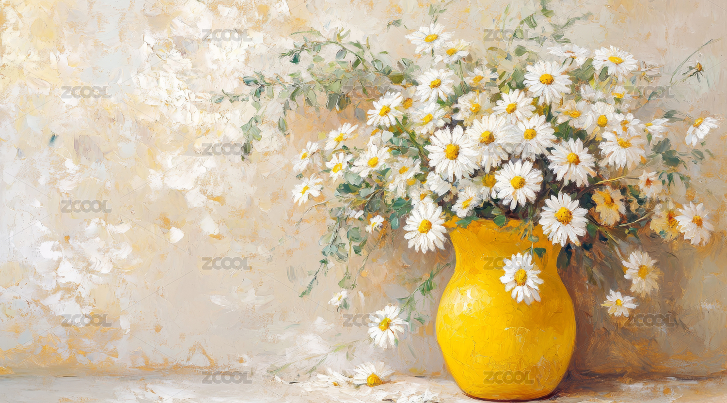 黄色花瓶中的雏菊静物画
