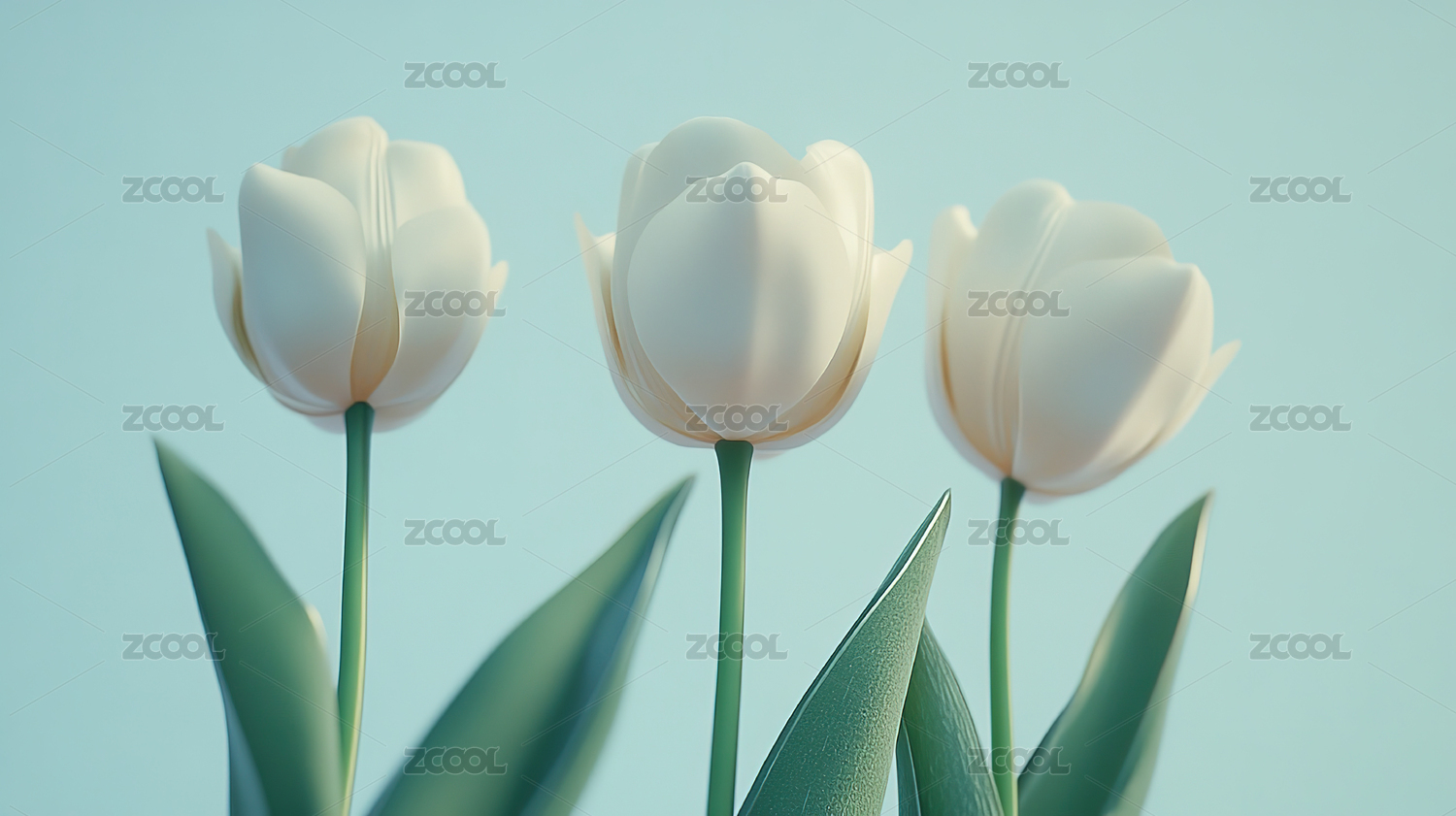 浅蓝色背景上的三朵粉色郁金香