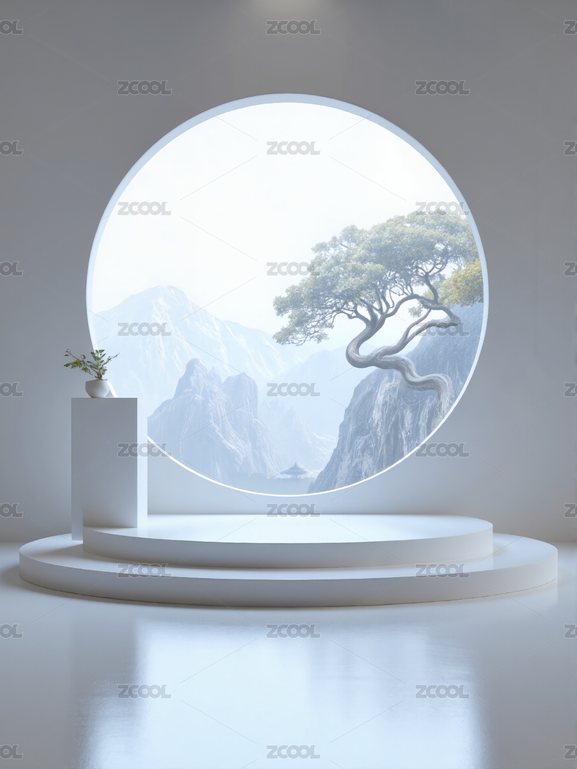 白色,简约,室内设计,圆形窗户,盆景,山景,白色花瓶,圆形平台,现代风格,宁静