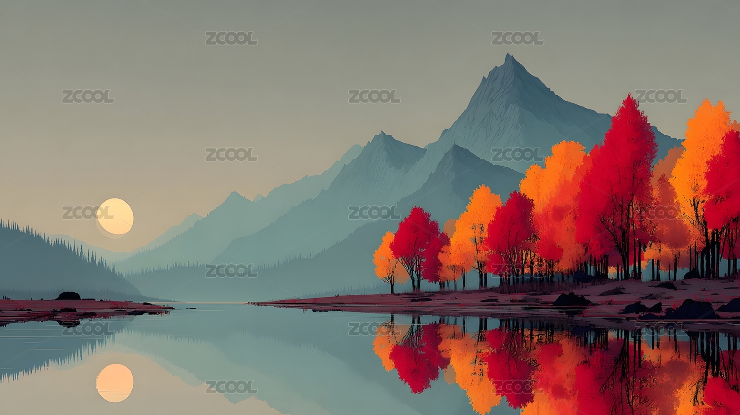 红叶,圆月,河流,山谷,草地,树木,森林,远山,岩石,溪流