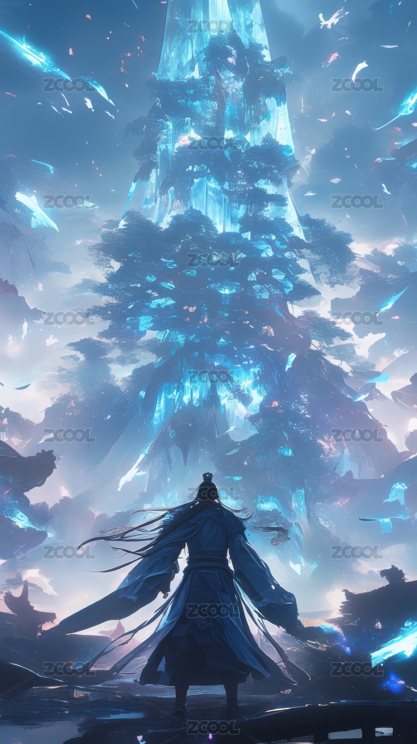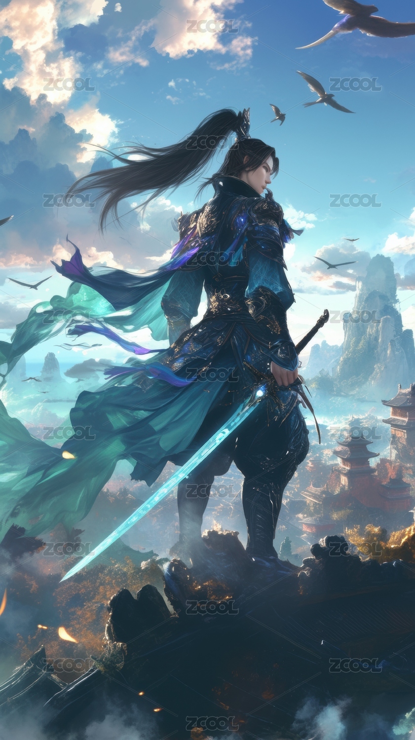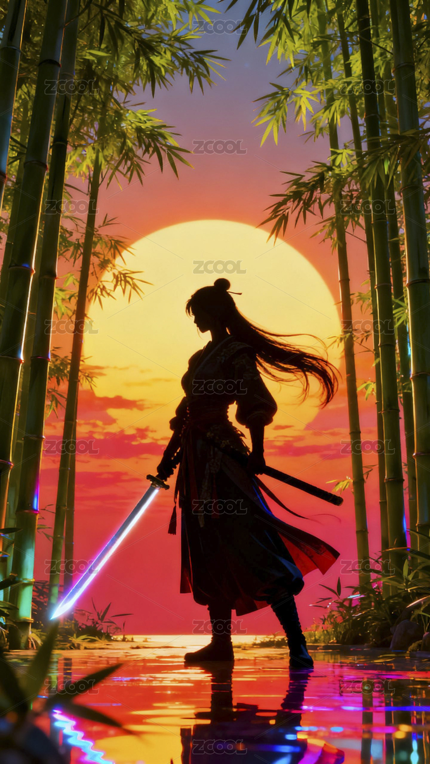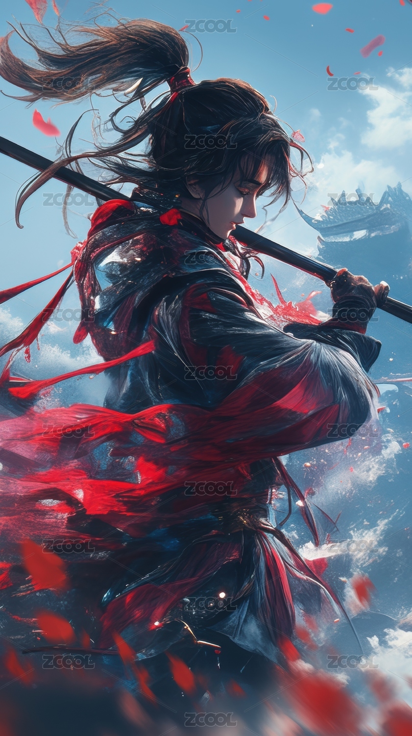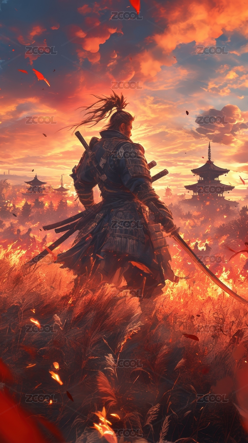 长发,插画,卡通,漫画,夕阳,战士,武器,战场,红色,英勇