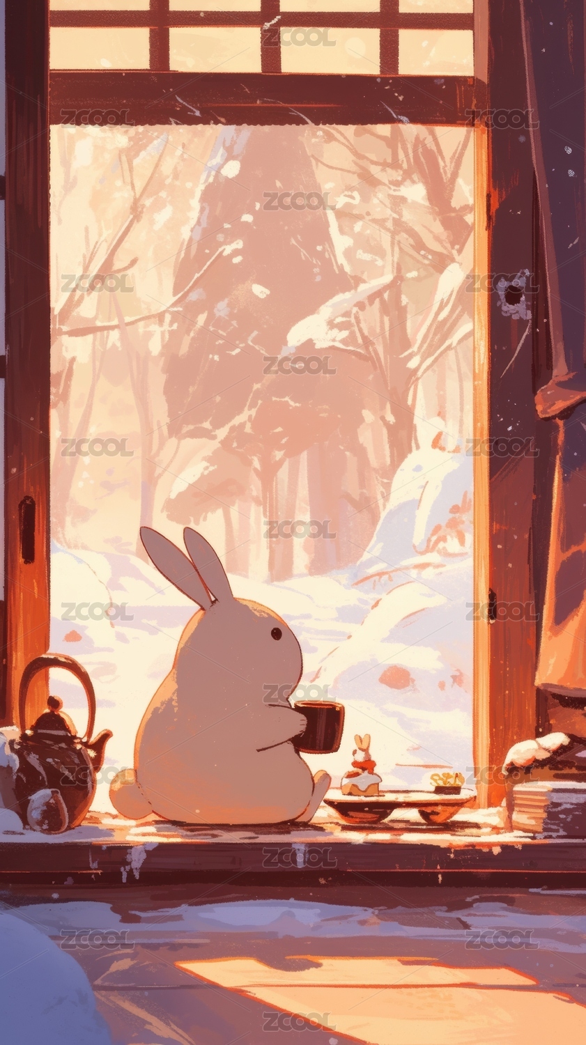 插画,卡通,漫画,温暖,装饰,室内,兔子,阳光,沙发,窗户