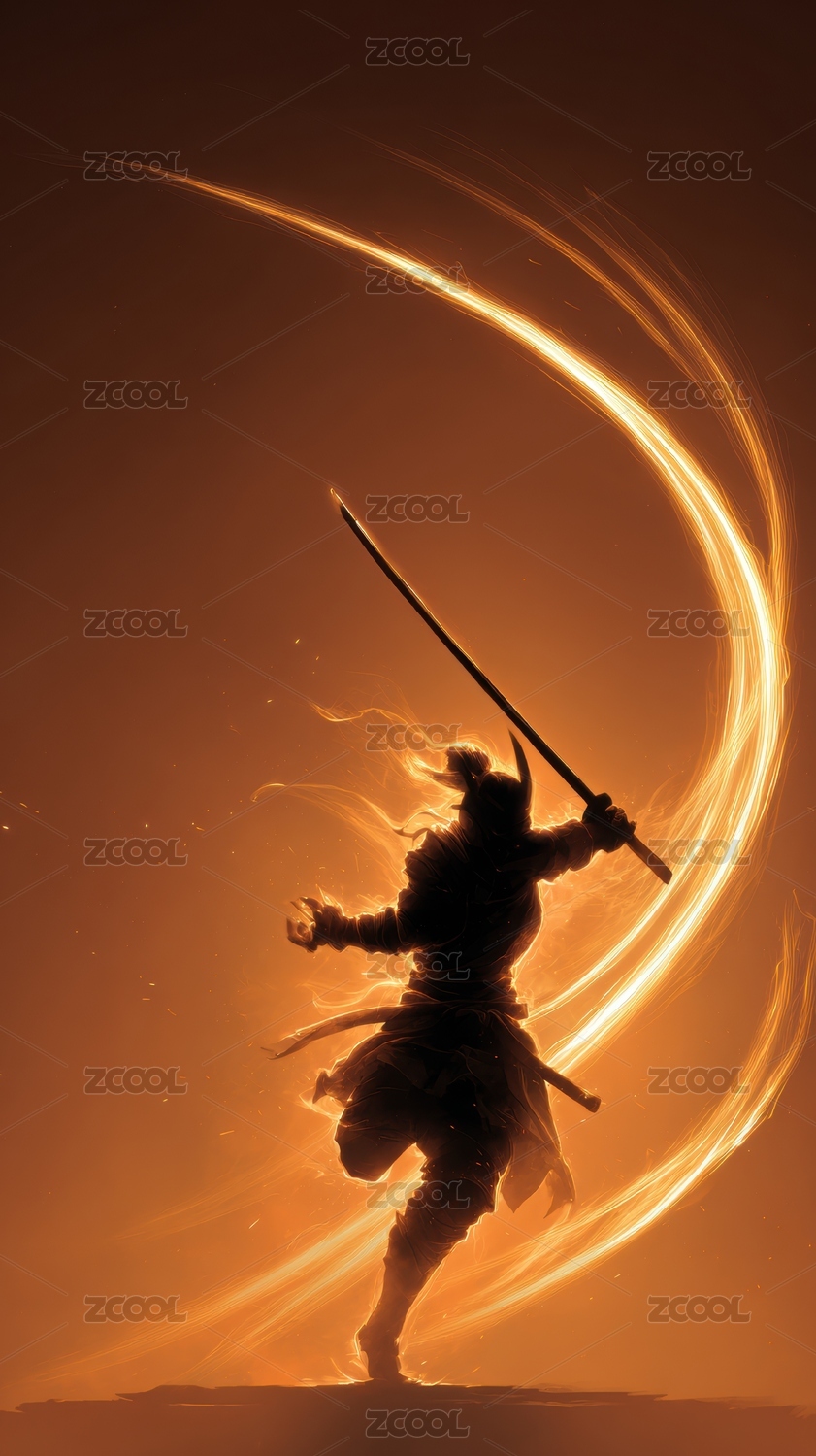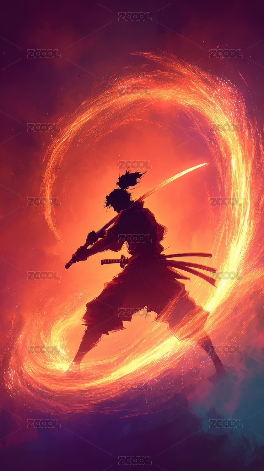 武士剪影与火焰旋涡