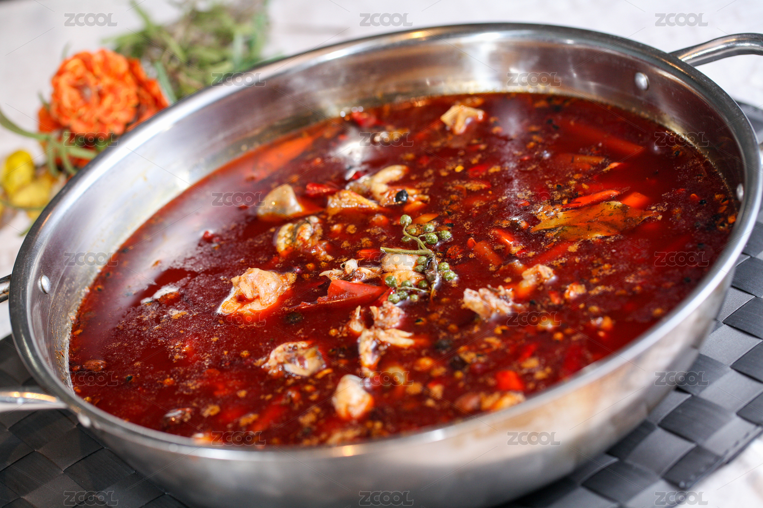大铜锅里的新鲜藤椒麻辣红汤牛蛙火锅