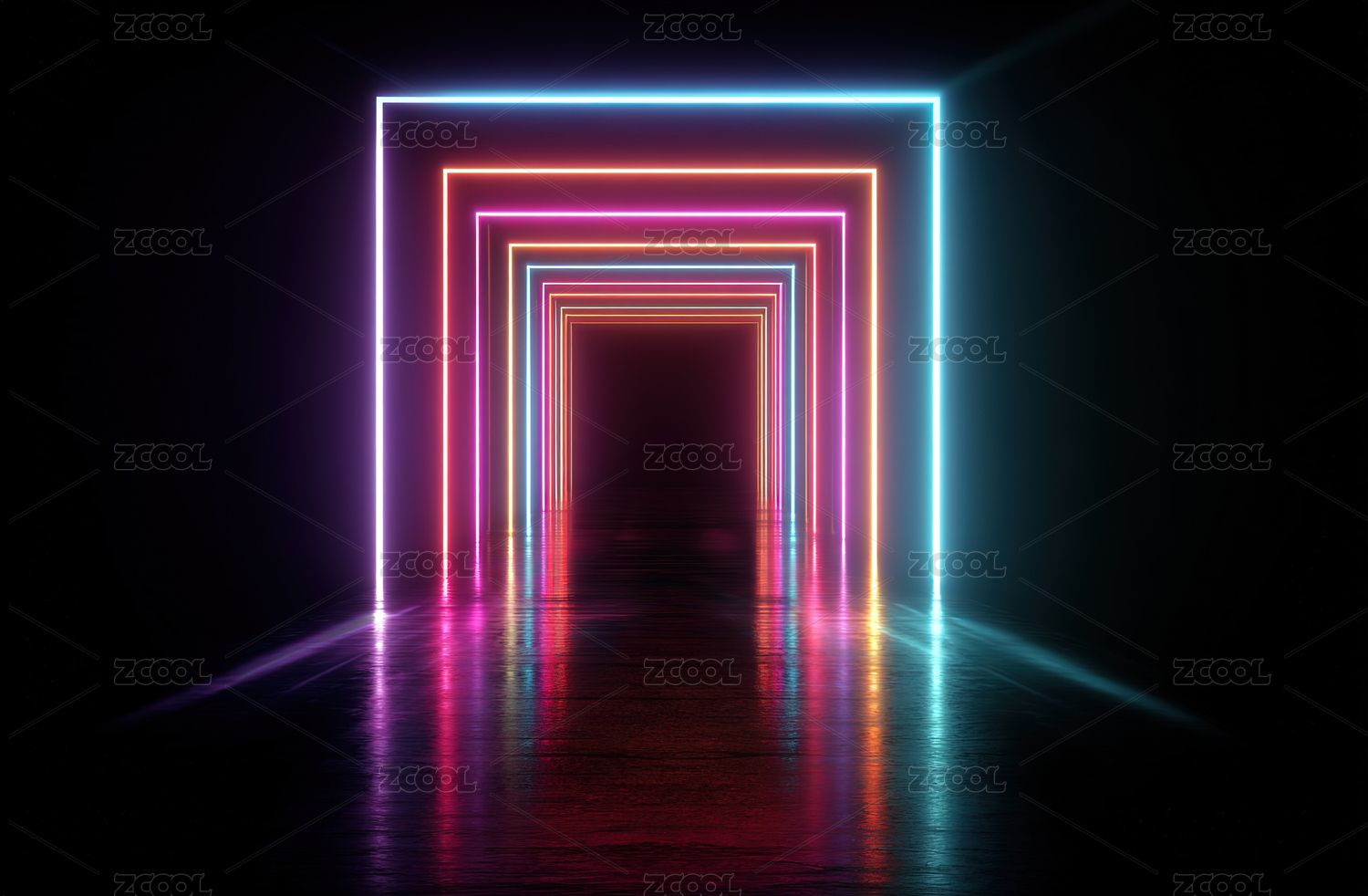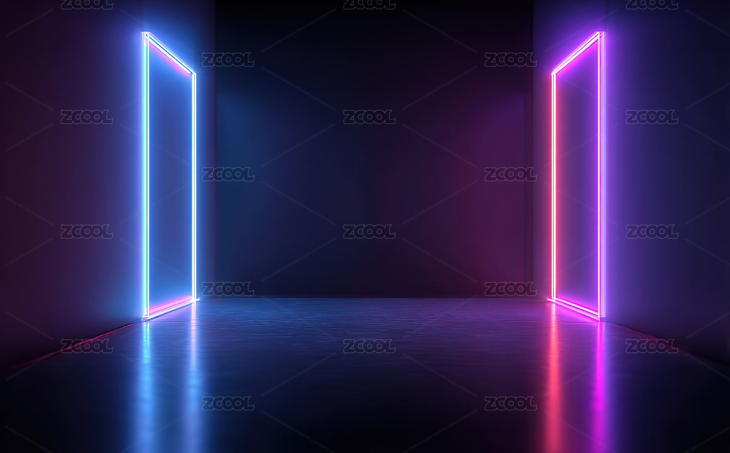 未来派科幻抽象蓝色和紫色霓虹灯形状在黑色背景和反光混凝土的留白空间,3D渲染图