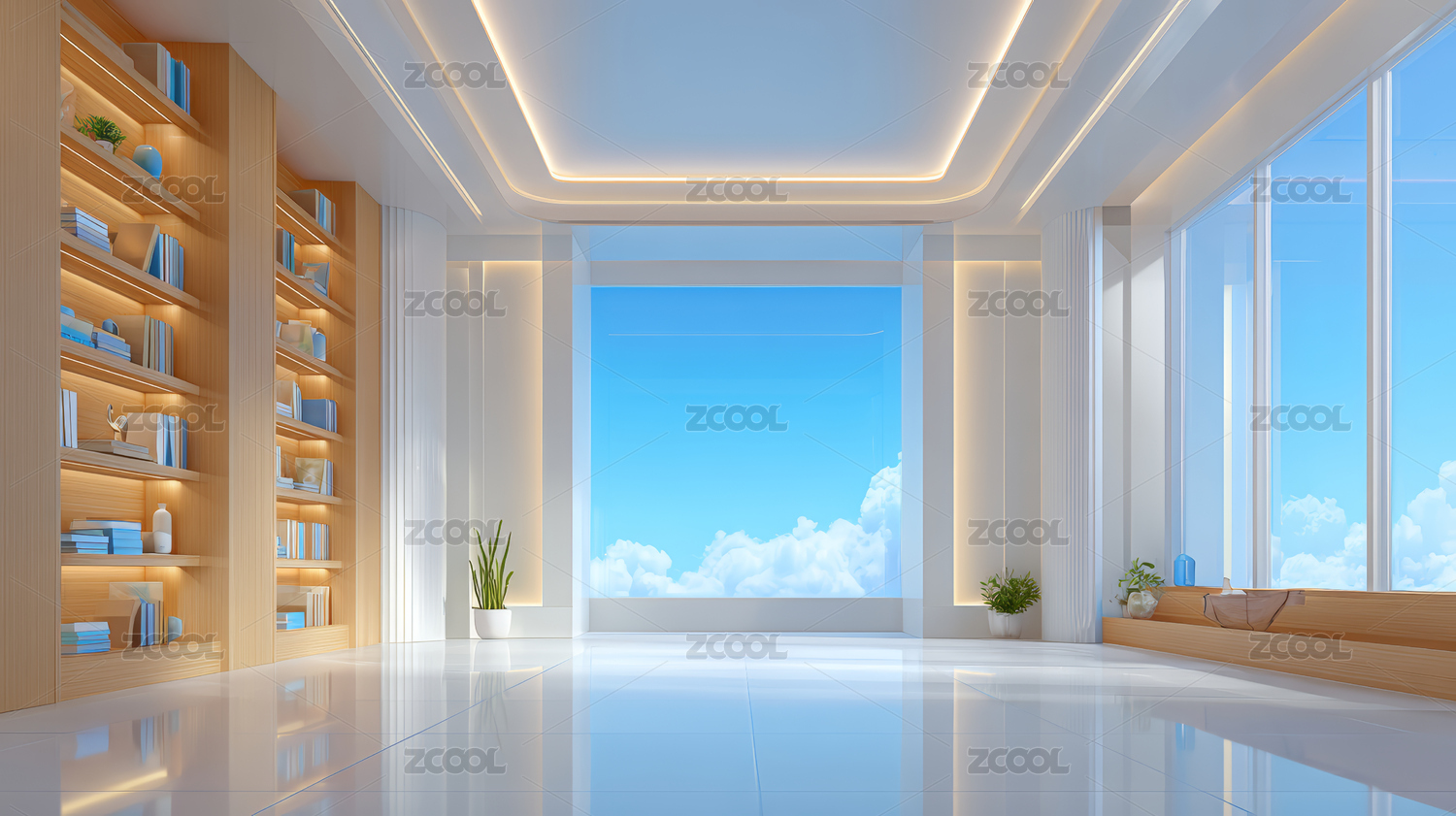 现代,室内,书房,图书馆,书架,休闲椅,绿植,白色,房子,大窗户