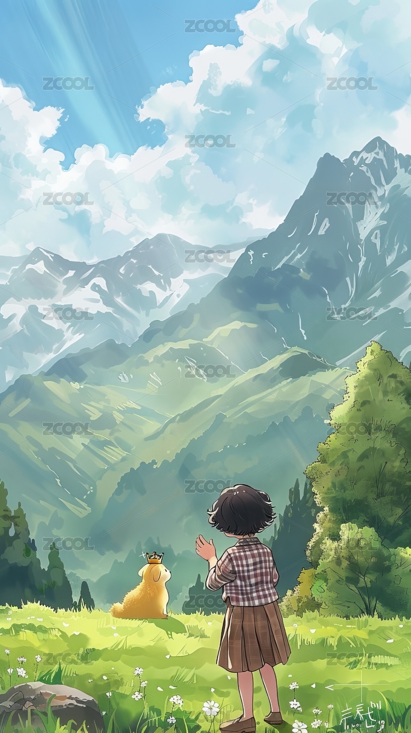 自然,插画,卡通,漫画,温馨,蓝天,白云,天空,云朵,女孩