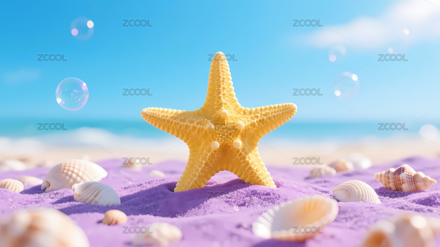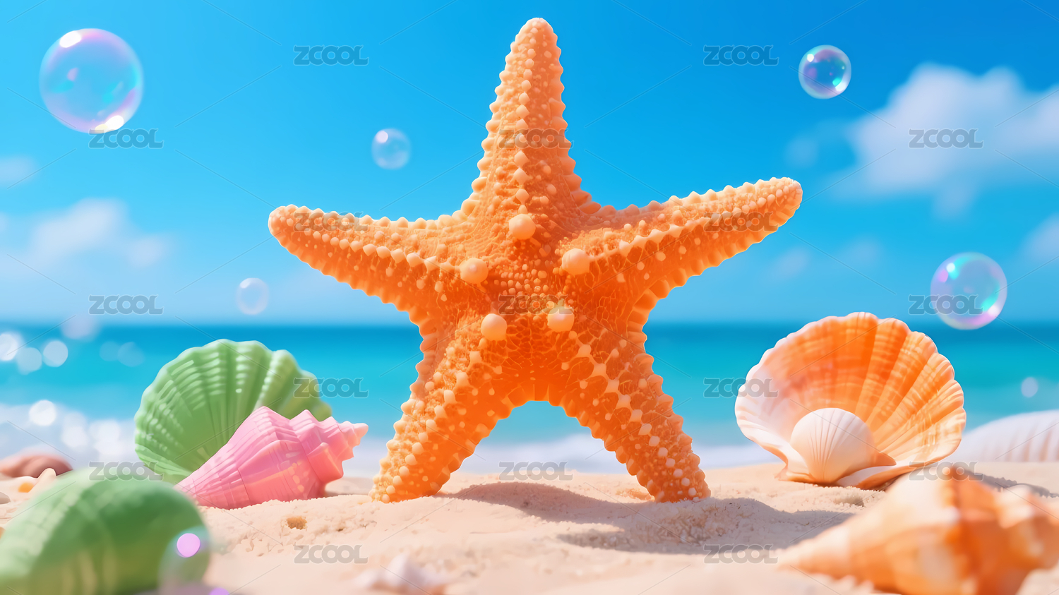 背景,光点,黄色,海星,沙滩,贝壳,泡泡,蓝天,大海,色调