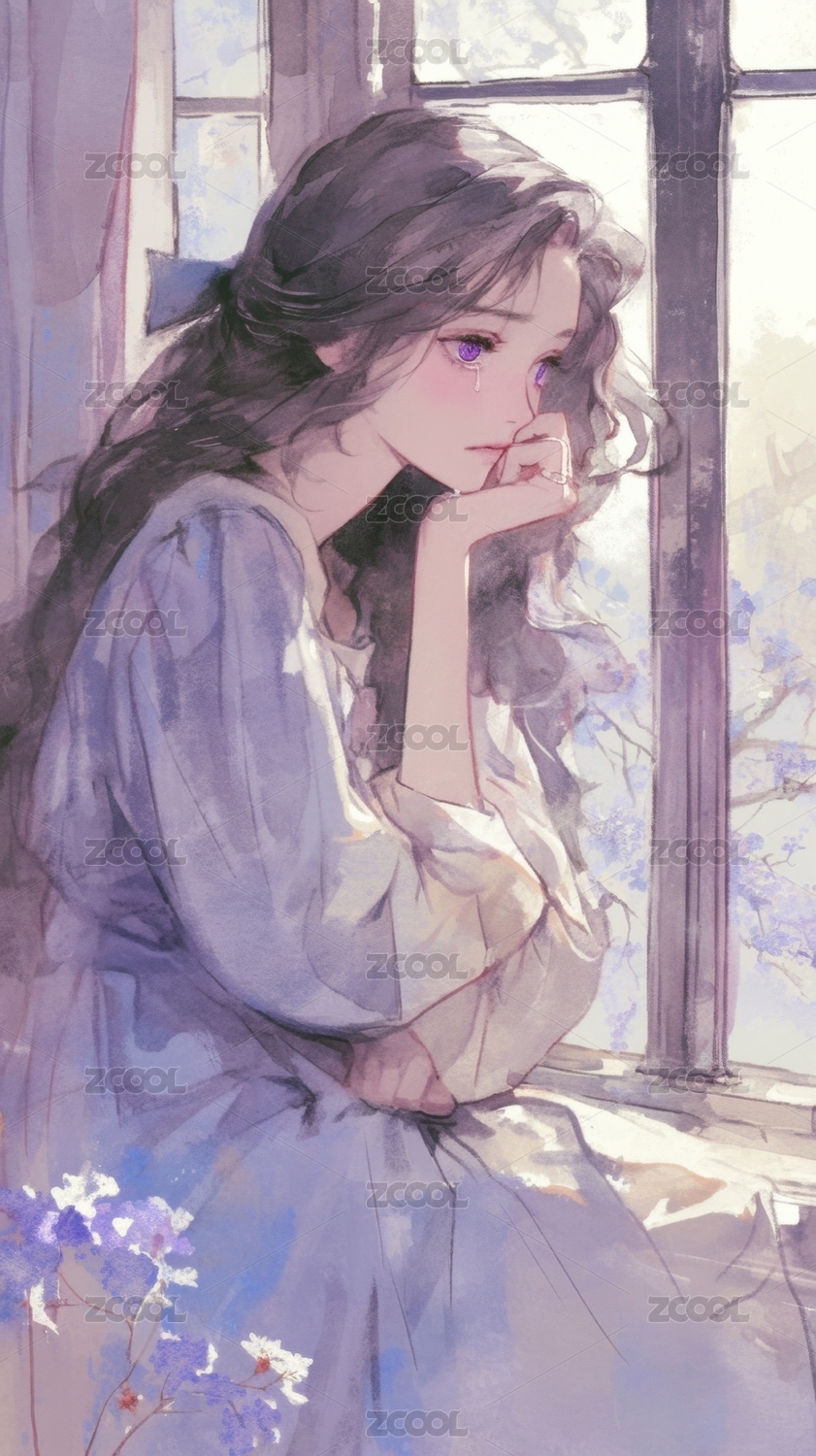 窗边沉思的少女