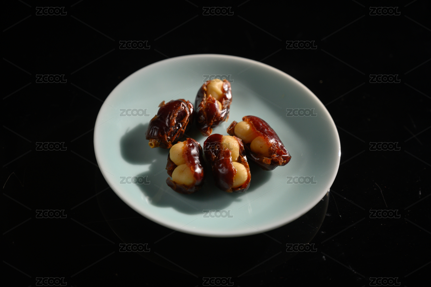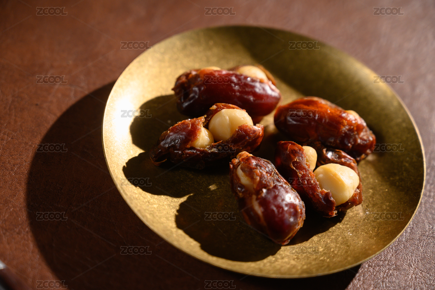 桌面上的盘子里的美味可口的椰枣夏威夷果仁