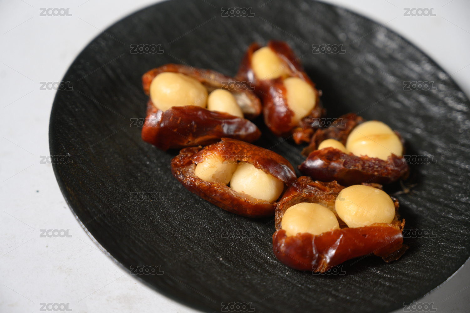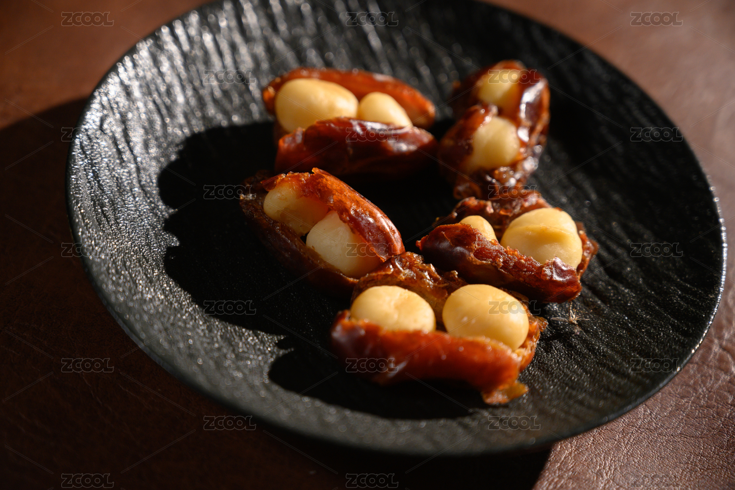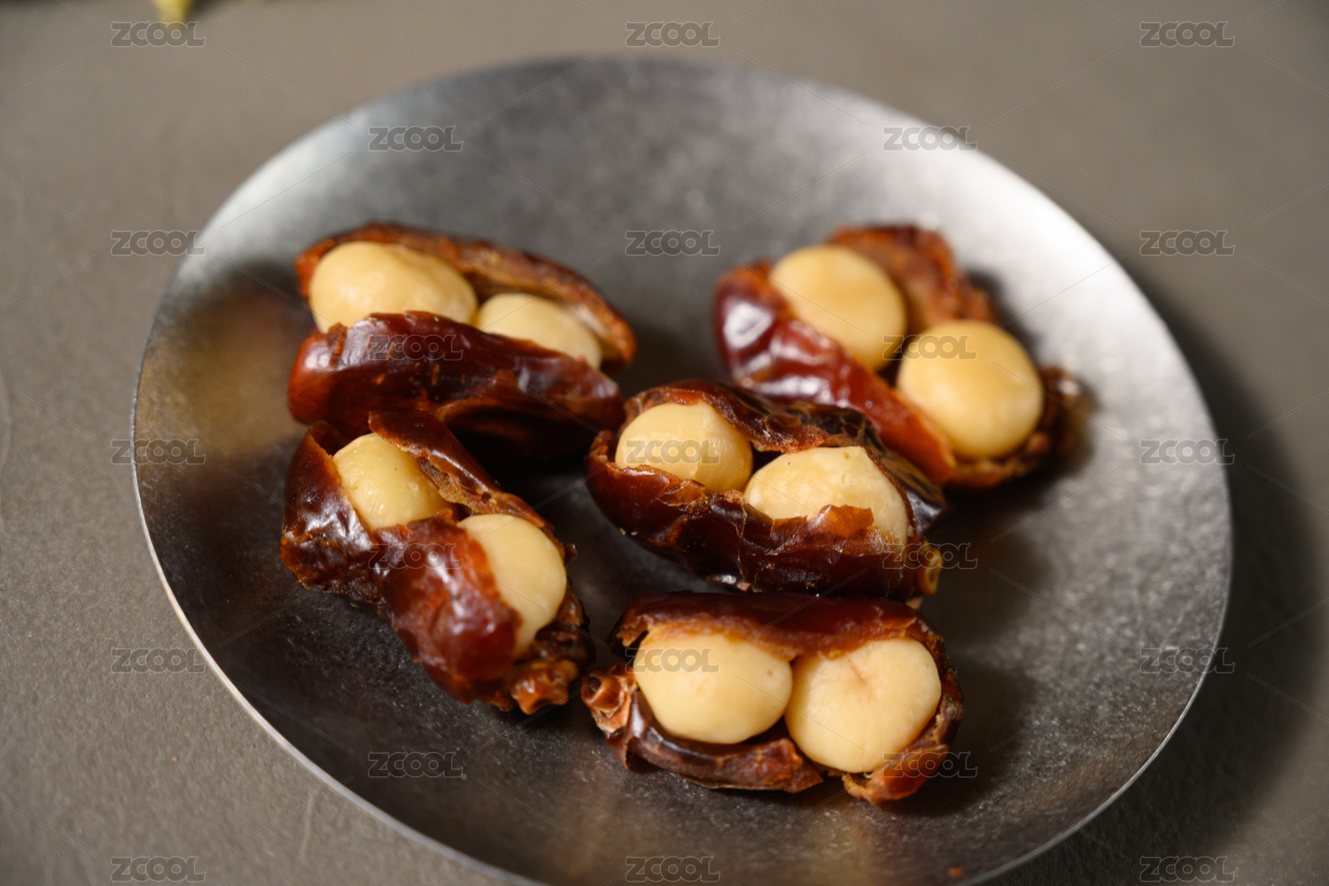 桌面上的盘子里的美味可口的椰枣夏威夷果仁
