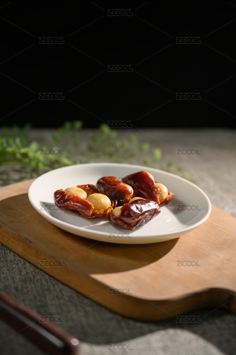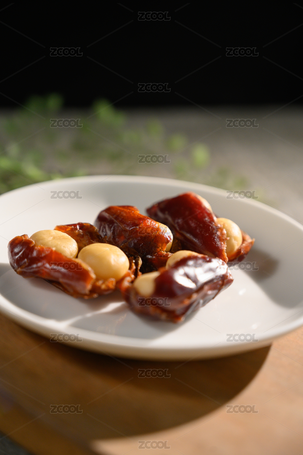 桌面上的盘子里的美味可口的椰枣夏威夷果仁