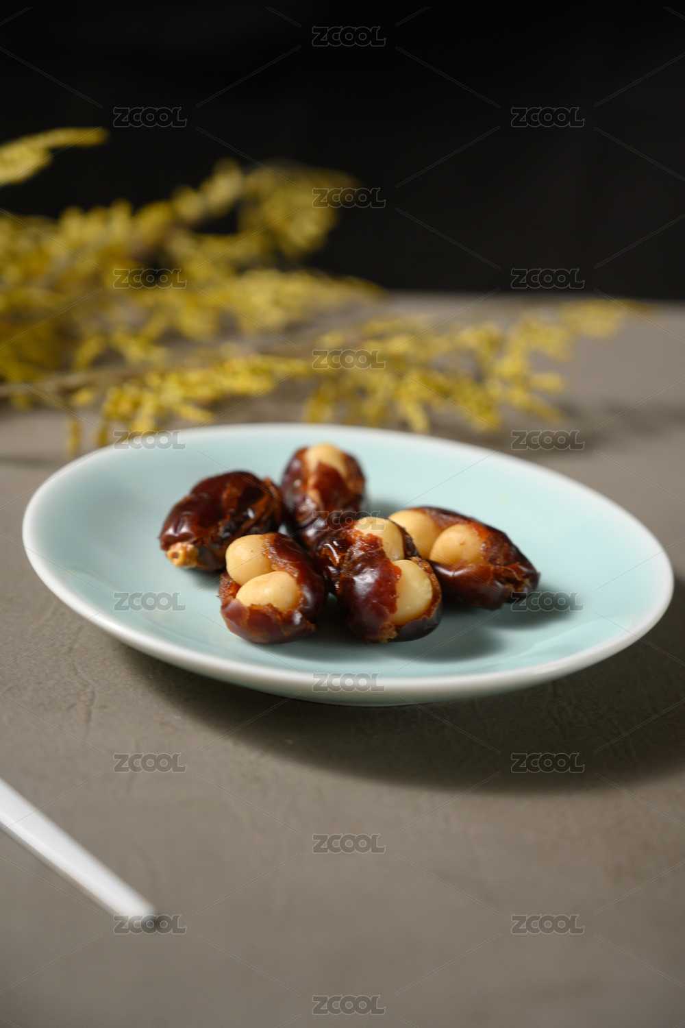 桌面上的盘子里的美味可口的椰枣夏威夷果仁