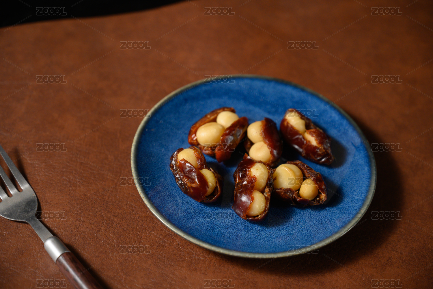 桌面上的盘子里的美味可口的椰枣夏威夷果仁