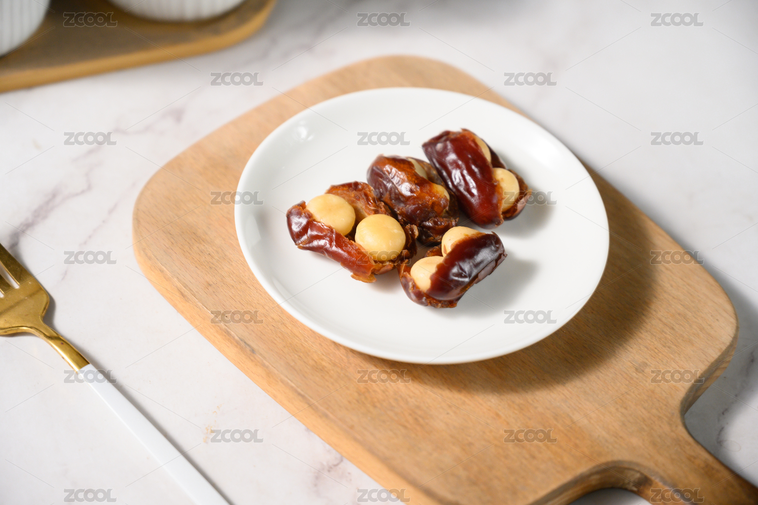 桌面上的盘子里的美味可口的椰枣夏威夷果仁
