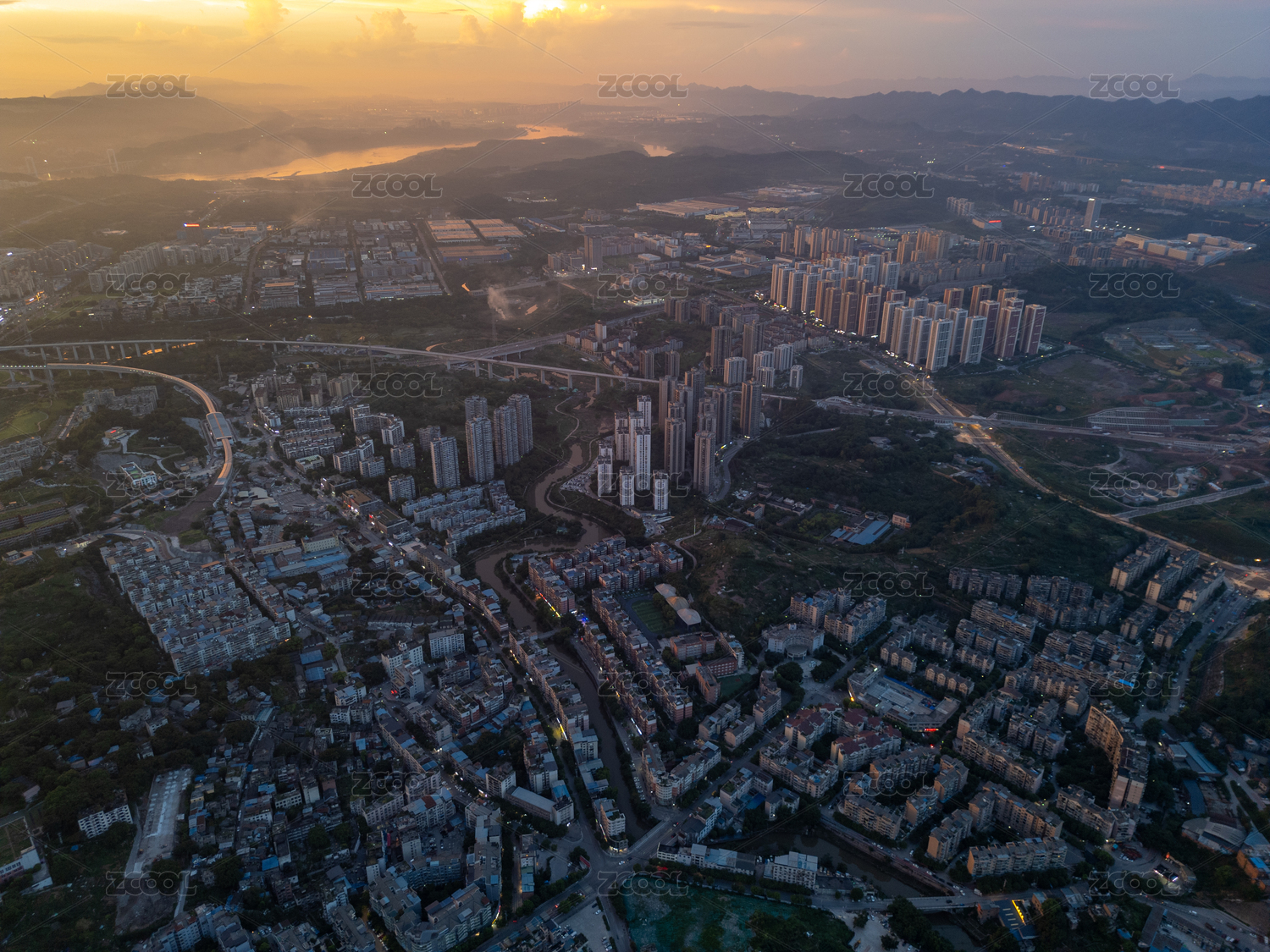 中国四川省巴中市黄昏夕阳城区高楼大厦建筑