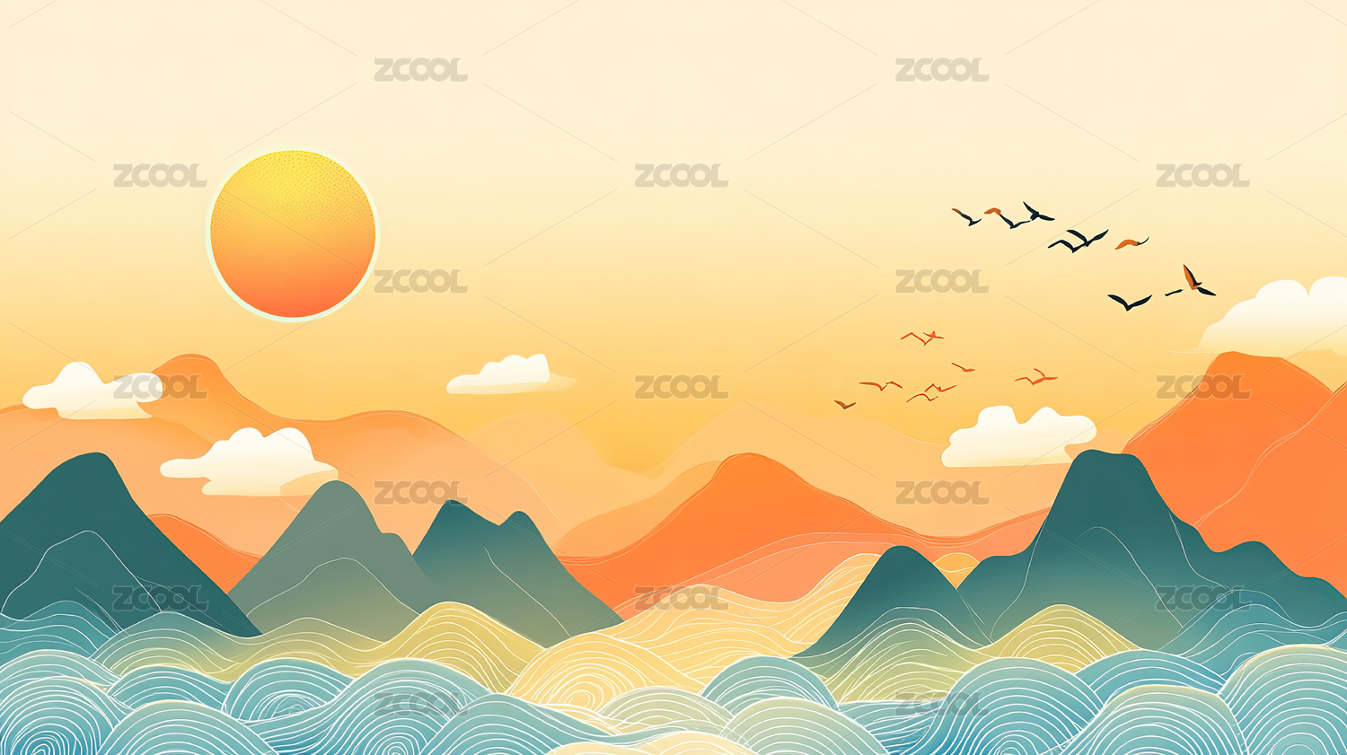 手绘竖版中国风时尚山水插画黄色的山绿色的