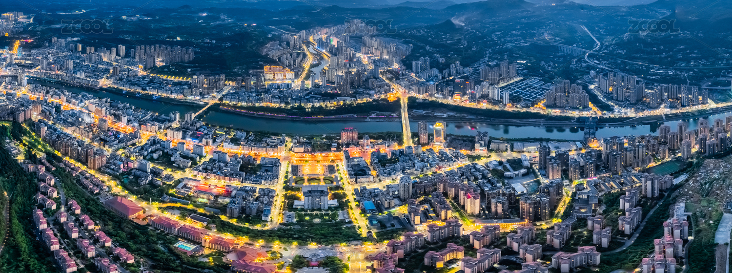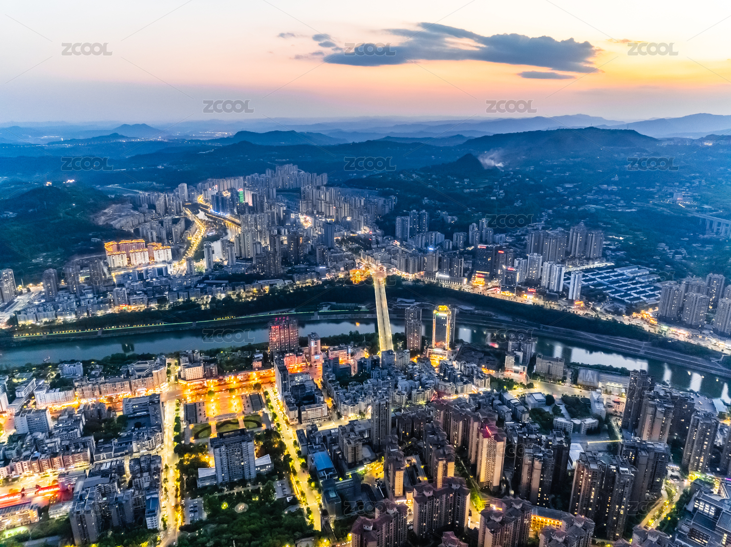 中国四川省南部县黄昏夜幕嘉陵江外滩建筑