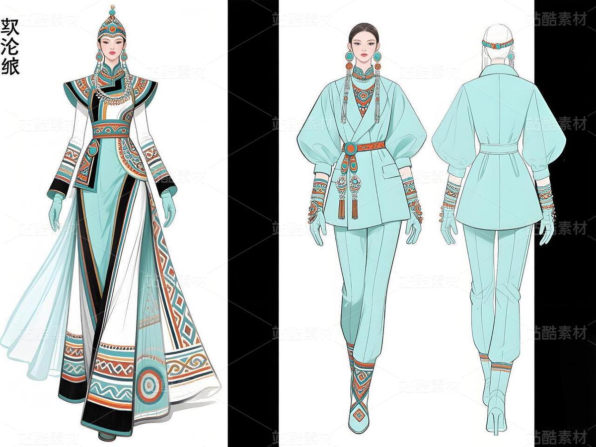 此系列以鄂伦春民族精神为魂,将传统狩猎文化与现代高定美学交融。银白色旗袍勾勒东方典雅曲线,衣身缀以手工刺绣的云卷纹、鹿角纹与几何图腾,象征森林民族的自然信仰。外套采用皮革与毛绒镶边,呼应狩猎服饰的原始野性;长裤流畅利落,搭配金属腰链与兽牙佩饰,强化力量感。手套与帽饰延续细腻纹样,蓝红金彩线交织于素白底色上,形成强烈视觉张力。整体设计既保留民族符号的深邃意蕴,又以当代剪裁重构鄂伦春族的冰雪森林史诗。