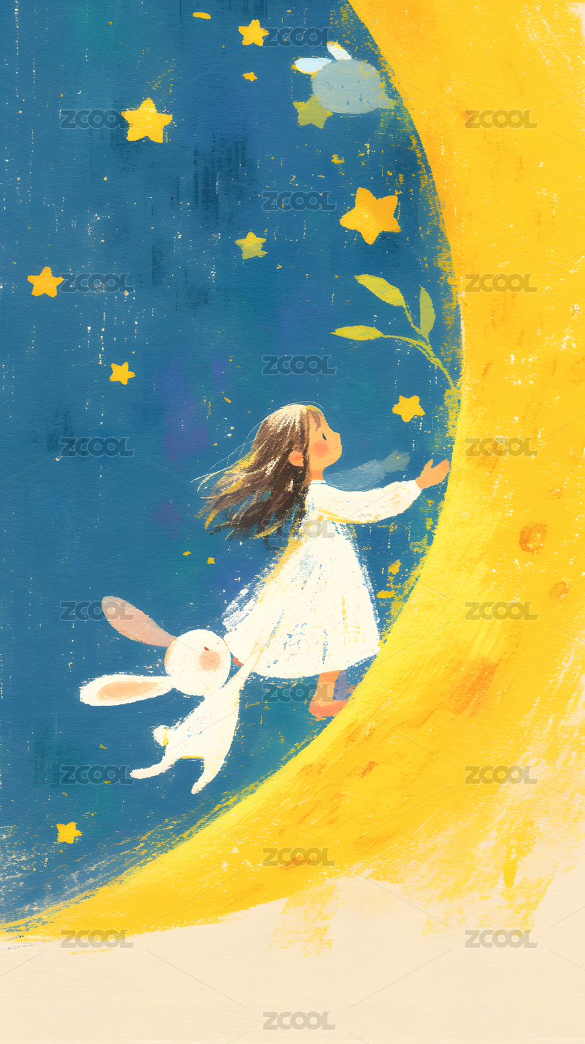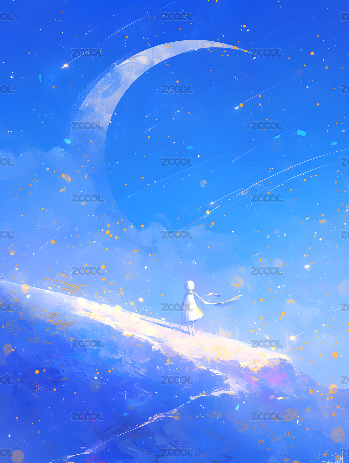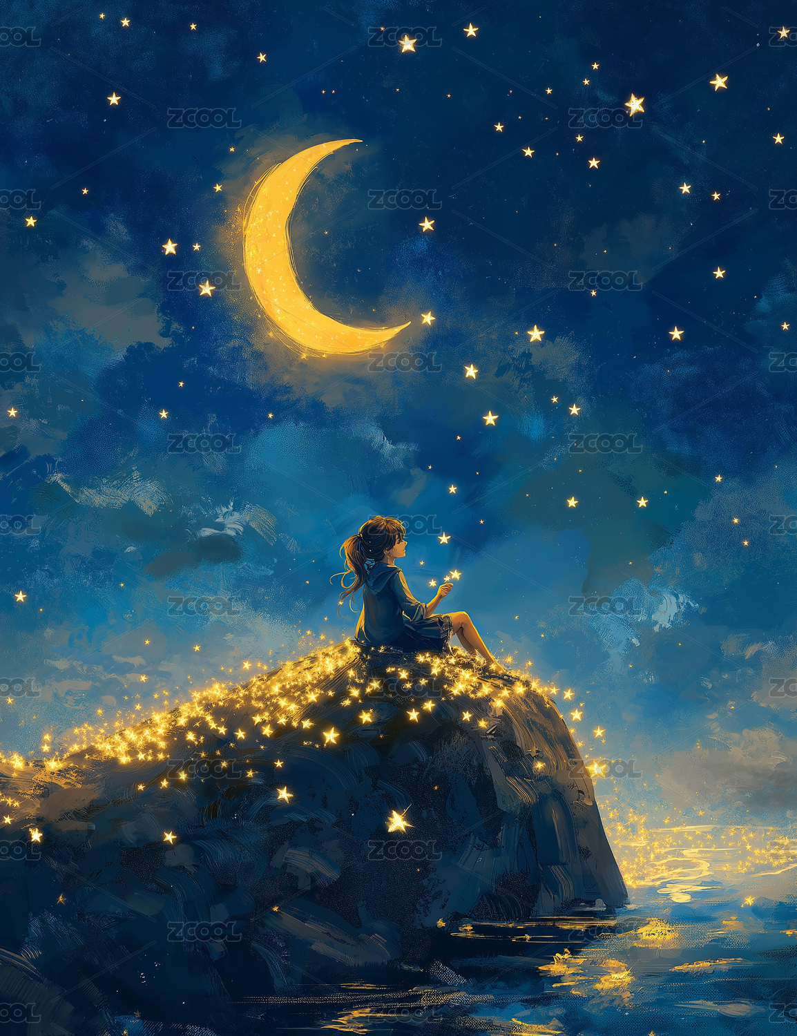 夜晚星空下女孩想通过星星天梯爬到月亮上去