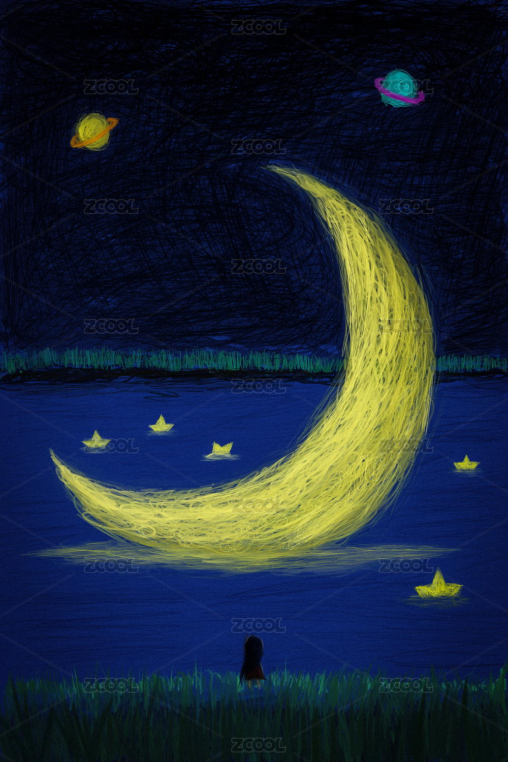 玩耍,幻想,蓝色,天空,大海,女孩,月亮,插画,梦幻