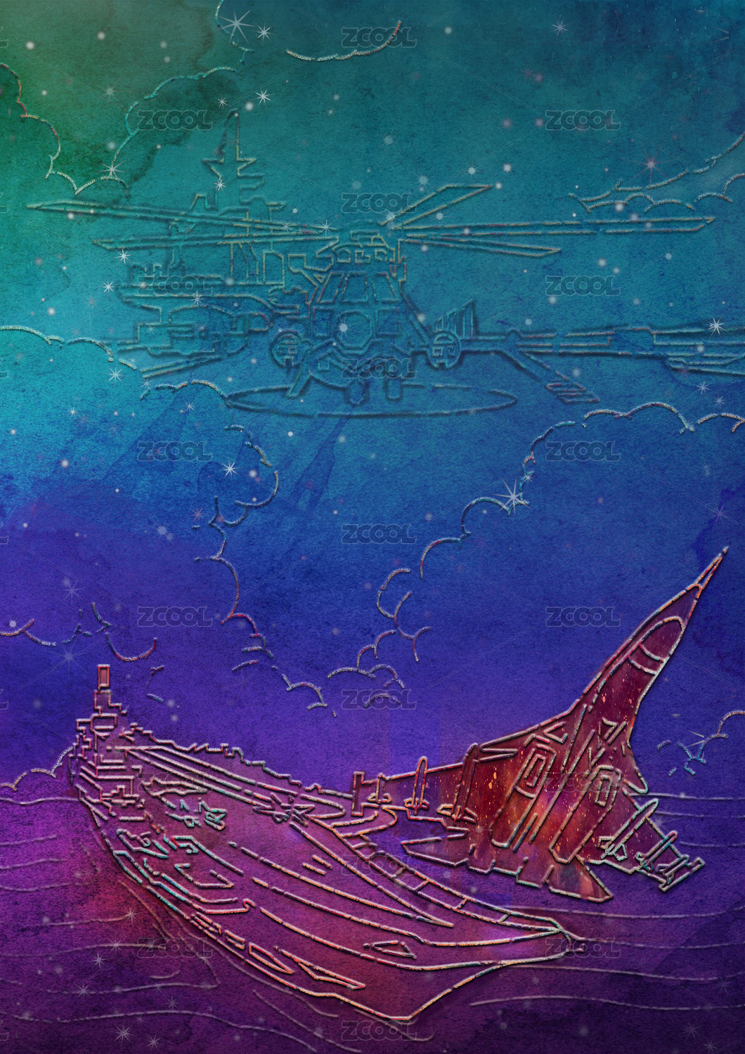 蓝色背景下飞机在航母上起飞图