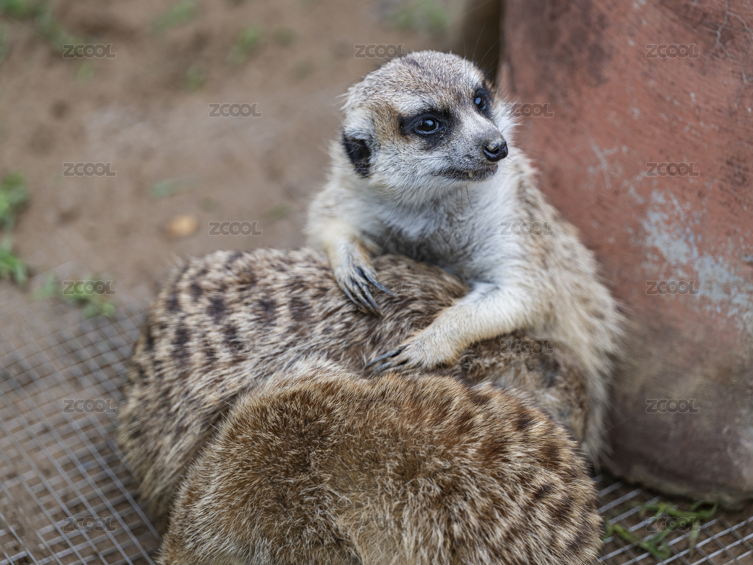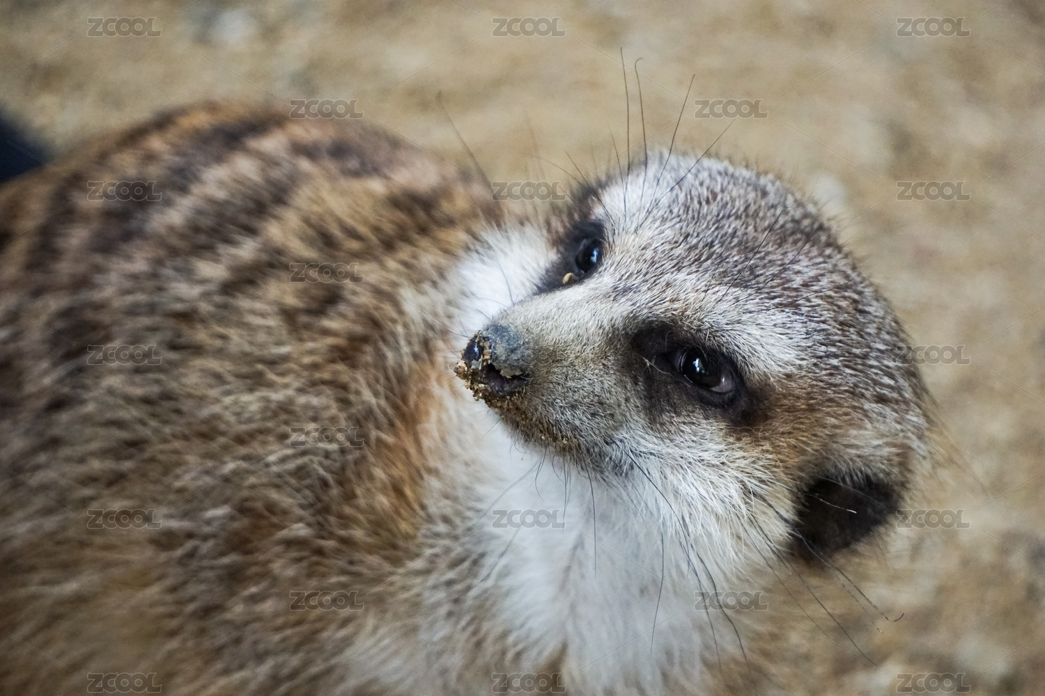动物园里棕白毛色猫鼬好奇表情侧脸特写
